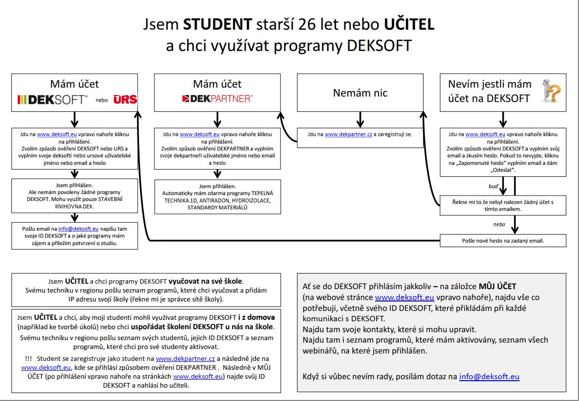 Pro plné využití výhod, které poskytuje registrace do programu DEKPARTNER je nutné mít propojen účet Dekpartner s účty jednotlivých společností DEK, jejichž aplikace a programy budu využívat. Do těchto účtů (ÚRS, DEKSOFT apod.) je třeba se pak připojovat vždy identitou Dekpartner. Pro zjednodušení správného postupu při registraci, přihlašování či řešení potíží jsme připravili podrobné návody v závislosti na typu účtu Dekpartner (projektant, student, učitel):