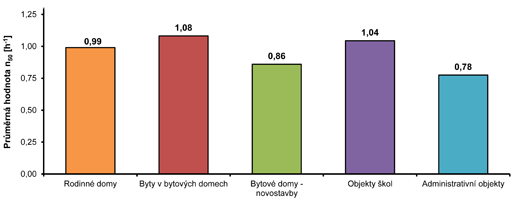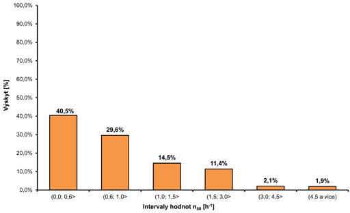 Zhruba 40 % z provedených měření dosahuje hodnot n50 ≤ 0,6 [h-1], obr. 02. Z obrázku je také patrné, že téměř 85 % měření nepřesahuje hodnotu n50 = 1,5 [h-1]. Naopak hodnoty, které se blíží doporučené hodnotě celkové intenzity výměny vzduchu n50,N pro objekty s přirozeným nebo kombinovaným systémem větrání se vyskytují poměrně vzácně. Průměrná hodnota ze všech měření činí n50 = 1,06 [h-1].