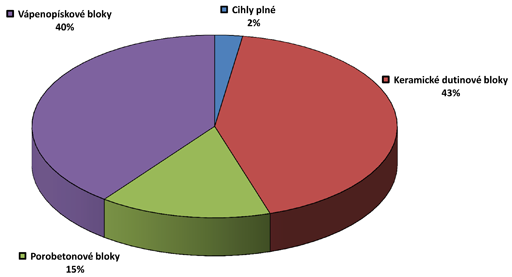 Konstrukční systémy obvodových stěn mají především u vícepodlažních budov dominantní vliv na hodnotu celkové průvzdušnosti jejich obálky. Zároveň mají vliv na technickou náročnost řešení detailů napojení s ostatními konstrukcemi (výplně otvorů, podlaha, střecha). Proto bylo přistoupeno u jednotlivých typů obvodových stěn k podrobnějšímu rozčlenění. První skupinou byly zděné obvodové stěny. Objekty byly roztříděny podle použitého typu kusového staviva (obr. 09):