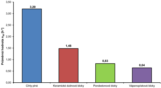 Z grafu na obr. 10 je patrné, že nejhorší hodnoty jsou v průměru zaznamenávány u objektů s obvodovými stěnami vyzděnými z cihel plných pálených. Tato skupina ale zahrnuje menší množství měření s převažujícím zastoupením rekonstrukcí stávajících objektů, kde zpravidla nebylo systémově zajištěno napojení vzduchotěsnicích vrstev střechy a obvodových stěn a řešení prostupů přes obálku budovy (např. připojovací spáry oken). Ostatní výsledky potvrzují zkušenosti z měření, že horší hodnoty jsou dosahovány u objektů, u kterých jsou pro obvodové stěny použity keramické dutinové bloky. U kusového staviva zajišťuje vzduchotěsnost především vnitřní omítka. Její narušení v kombinaci s četnými svislými dutinami v blocích a absence účinného přerušení v rovině ložné spáry znamenají riziko podstatného zhoršení vzduchotěsnosti obvodové stěny.