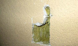 Majitel zděného rodinného domu z poloviny 20. století se rozhodl snížit energetické ztráty a oživit vzhled svého domu. Jedním z provedených opatření byla aplikace ETICS na obvodové stěny. Již v průběhu realizace výztužné vrstvy se začaly na fasádě objevovat skvrny v místě kotevních prvků. Skvrny se objevovaly prakticky na všech plochách fasády v závislosti na klimatických podmínkách (nízké exteriérové teploty, vyšší vlhkost vzduchu) a během dne postupně mizely. Při průzkumu stavby pro účely zpracování znaleckého posudku byly do skladby ETICS provedeny sondy, přičemž bylo zjištěno, že tepelnou izolaci ve skladbě ETICS tvoří desky z minerálních vláken, které jsou upevněny k podkladu plastovými hmoždinkami s kovovým trnem (obr. 01, 02).