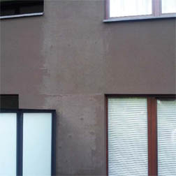 Zcela jinou příčinu nestejnoměrného zbarvení fasády měly další případy. Na posuzovaných objektech se až po několika letech od realizace začaly objevovat menší či větší neohraničené plochy s výrazně světlejším zbarvením než okolní odstín.
