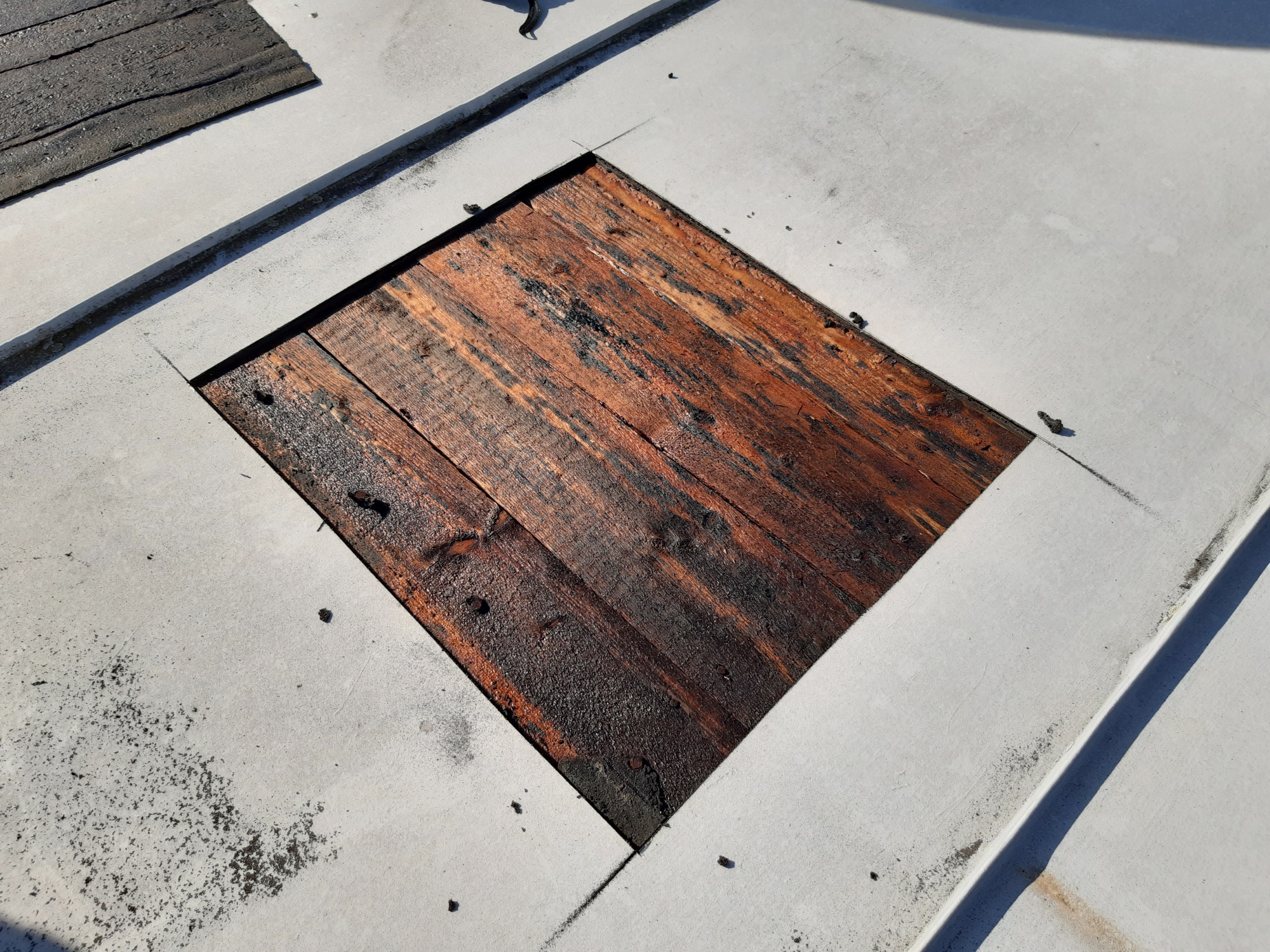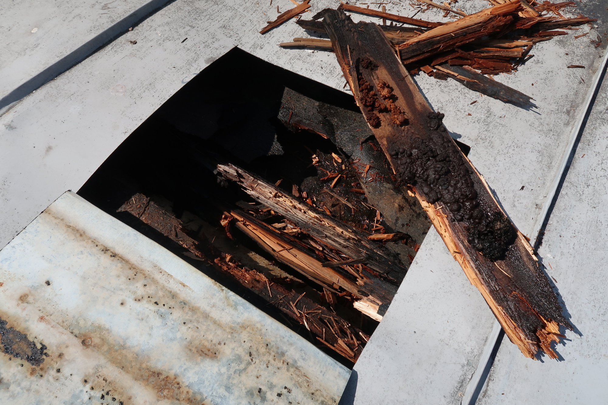 Sonda č. 1 – Pod krytinou a podkladním pásem se nacházelo bednění, které bylo mokré a jevilo známky začínajícího biologického napadení. Pod bedněním se nacházel rovněž mokrý a biologicky napadený krov. Na původním střešním plášti byly patrné stopy po úkapech vody.