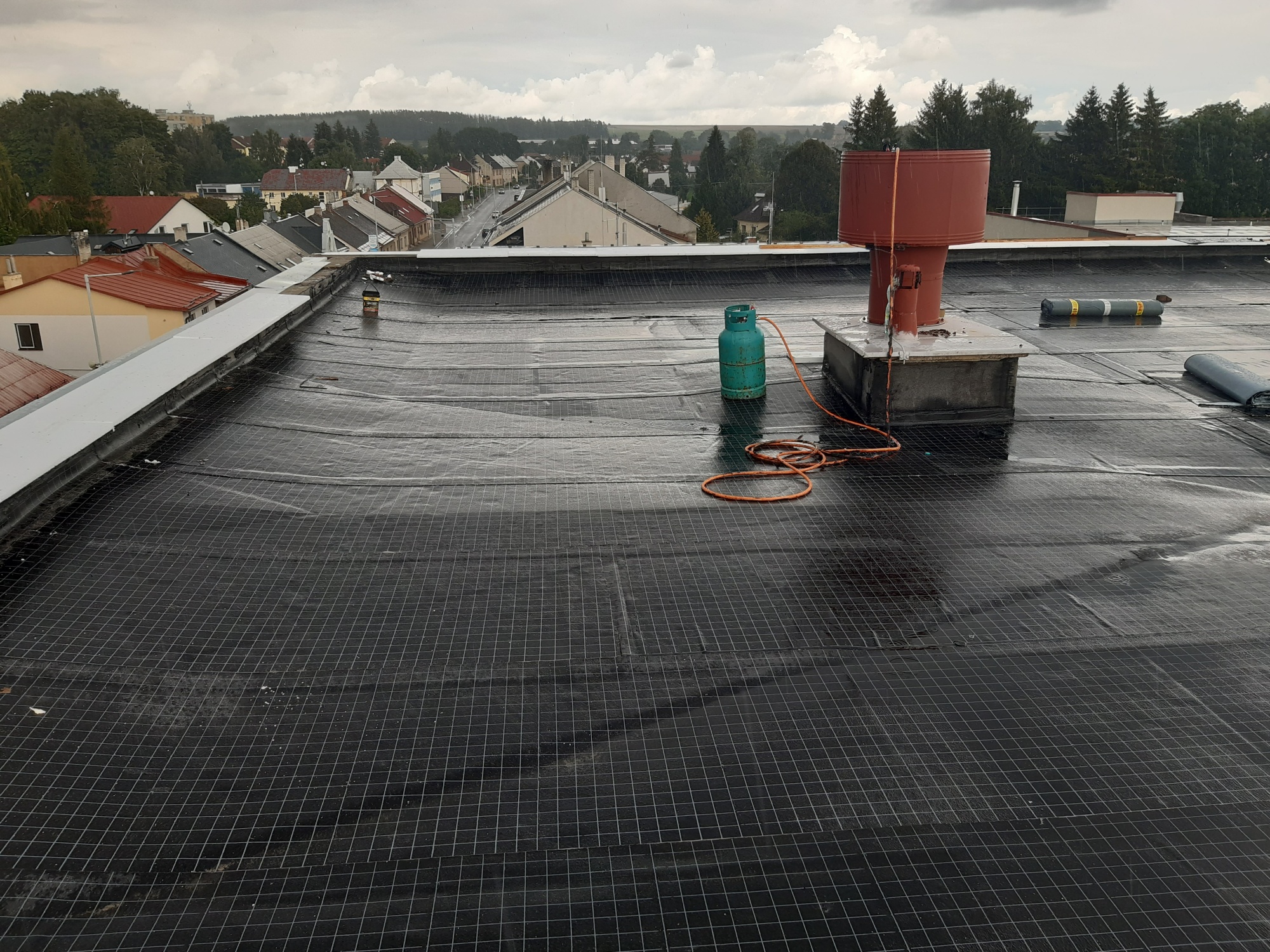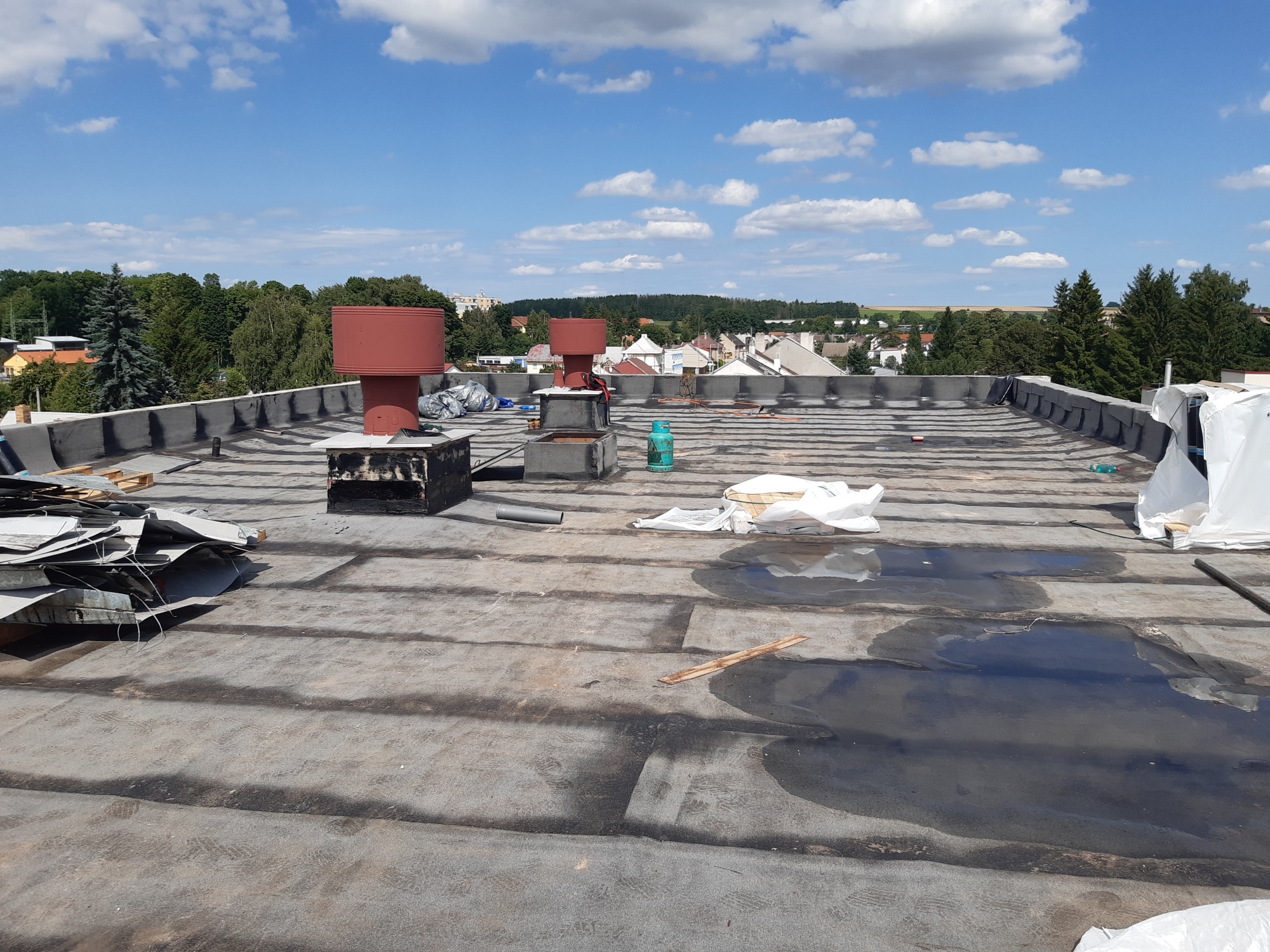 Na základě zjištěných poznatků jsme spolu s realizační firmou a investorem začali profilovat novou podobu rekonstrukce této střechy. Od začátku bylo jasné, že shnilý horní plášť musí vč. krytiny kompletně pryč. Myšlenka navrhnout zpět dřevěný horní plášť byla zavržena prakticky hned v zárodku a to zejména ze strachu z podobného osudu střechy, byť by byla snaha o návrh dostatečného větrání mezi oběma plášti. Zvítězil tedy návrat k jednoplášťové střešní konstrukci. Horní plášť dvouplášťové střechy byl vč. podezdívek kompletně demontován. Na původní hydroizolační souvrství z oxidovaných asfaltových pásů z roku 1968 byl přivařen asfaltový pás GLASTEK 40 SPECIAL MINERAL včetně napojení na veškeré navazující a prostupující konstrukce. Vznikla tak parotěsnicí vrstva pro novou skladbu střechy. Všechny další vrstvy byly k původní skladbě lepeny. Tepelná izolace včetně spádových klínů z EPS byla k podkladu i vzájemně lepena střešním polyuretanovým lepidlem. Následovalo nové hydroizolační souvrství ze samolepicího asfaltového pásu a vrchního natavitelného pásu s břidličným posypem.