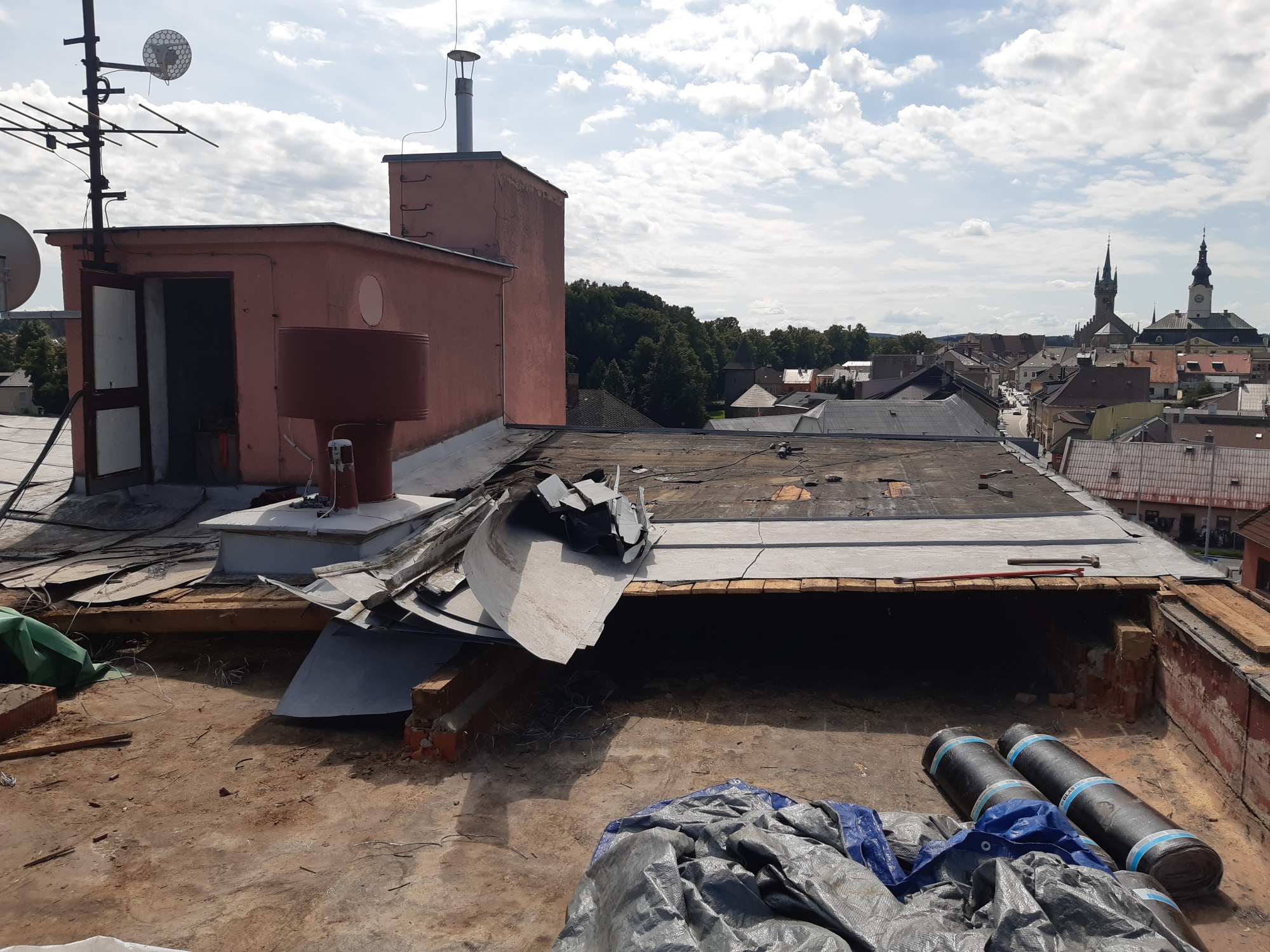Rekonstrukce střechy v roce 1990 spočívala ve změně z jednoplášťové střechy na střechu dvouplášťovou s dřevěným horním pláštěm a s plechovou hladkou krytinou spojovanou na drážky. V roce 2021 proběhla další rekonstrukce střechy poté, co se zjistilo, že je v havarijním stavu. Na ten se přišlo až při prohlídce střechy, na kterou jsem byl přizván realizační firmou, která měla za úkol přijít na příčinu zatékání, které začalo obyvatele domu v posledních letech opět trápit.