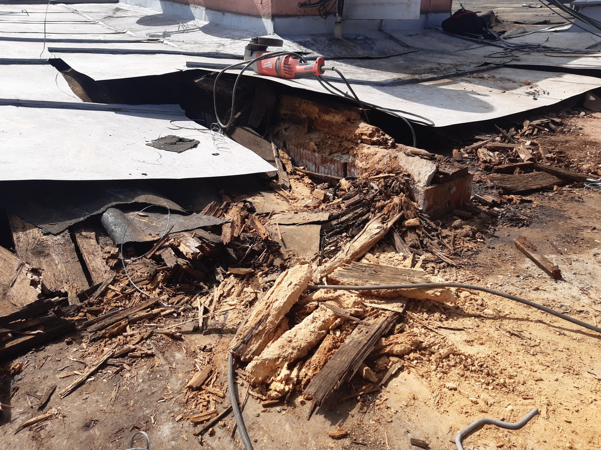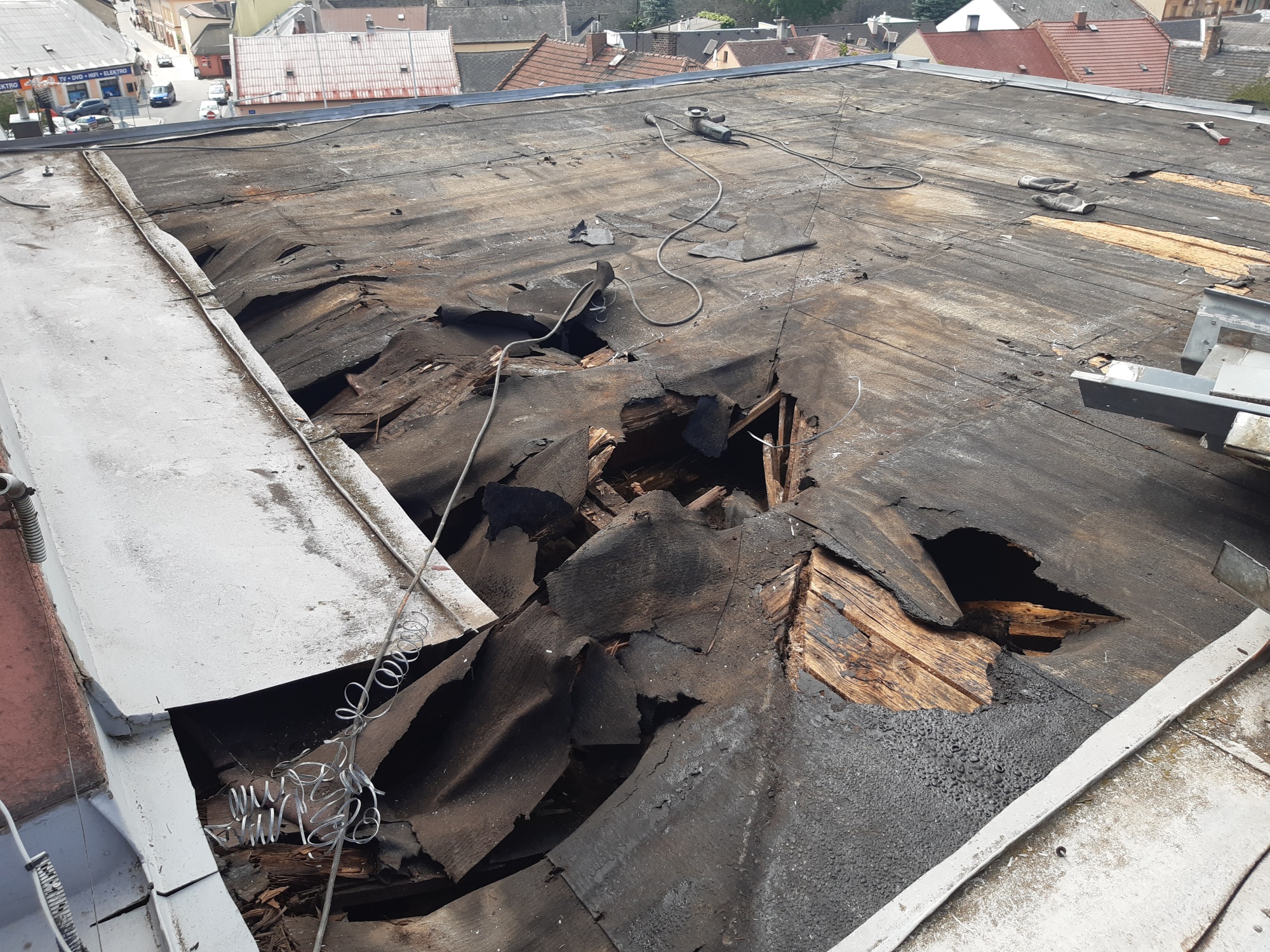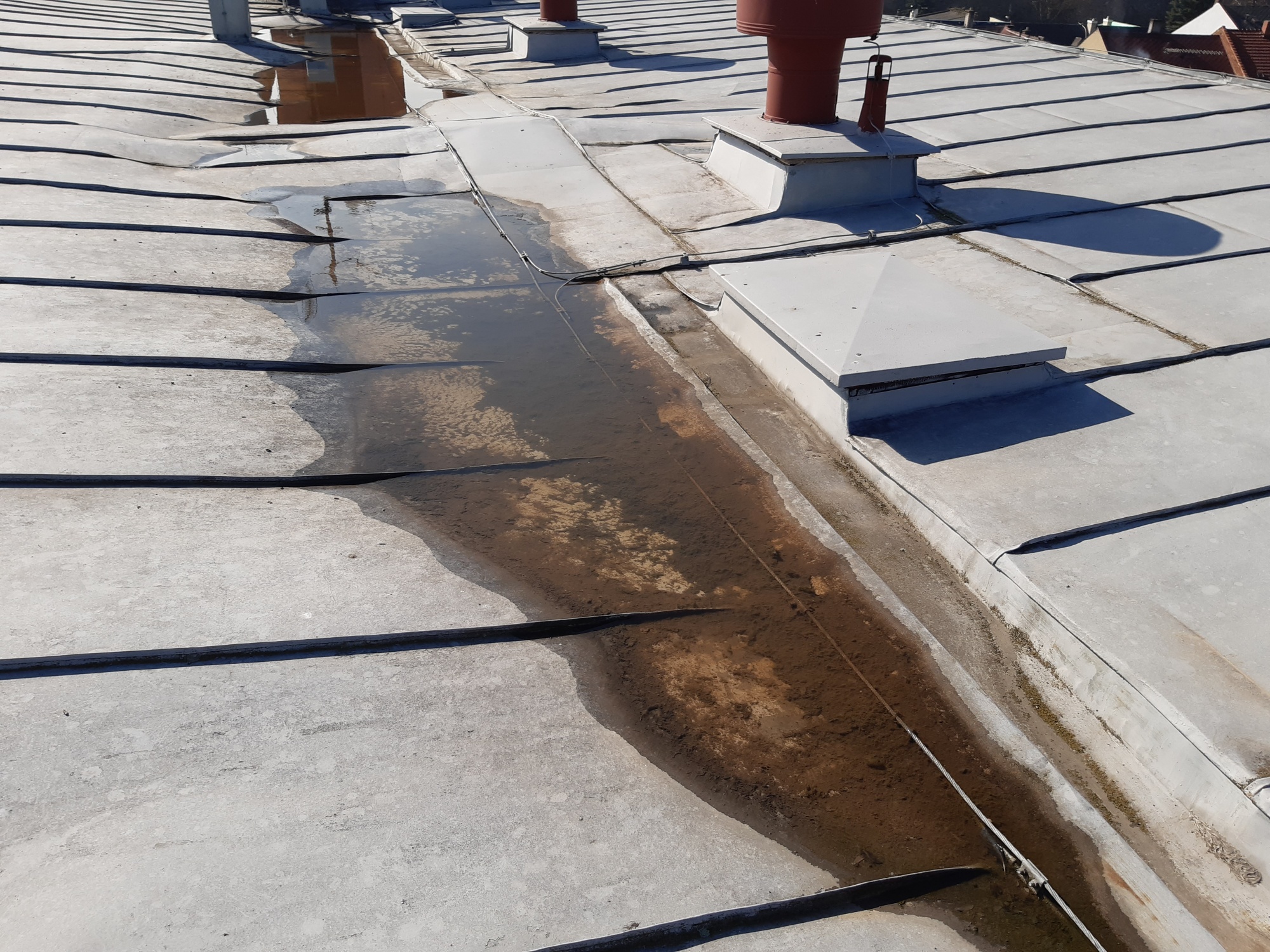 Již při prvotní obhlídce střechy bylo jasné, že problém je daleko závažnější, než si obyvatelé domu původně mysleli. Na střeše byly podél středových žlabů velké kaluže vody spolu s nečistotami. Spoje krytiny byly v kalužích namáhány tlakovou vodou a zřejmě ji propouštěly. Dále bylo zjištěno, že v některých místech již není pod krytinou tuhý podklad a krytina se propadá, také již není dostatečně stabilizována proti působení větru a je tedy nebezpečná pro své okolí. Uvolnění krytiny začalo způsobovat její pohyby a ty vyvolaly další defekty jako boulení a praskliny v namáhaných místech. Původní záměr drobné opravy tak vzal za své a tento havarijní stav bylo nutné okamžitě řešit.