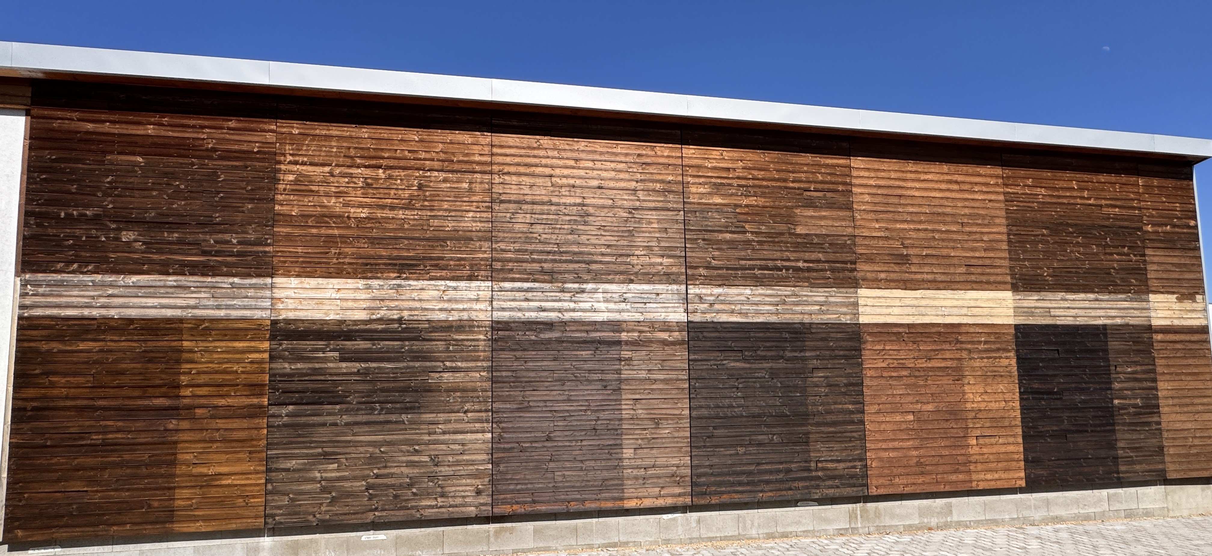 Na fasádě experimentální budovy jsou umístěny vzorky dřevěných obkladů s různými typy nátěrů a několika variantami ošetření podkladu. Testujeme zde barevnou stálost, trvanlivost a účinnost ochrany povrchu. Sledujeme rozdíly mezi nátěry jednotlivých výrobců i způsoby aplikace.