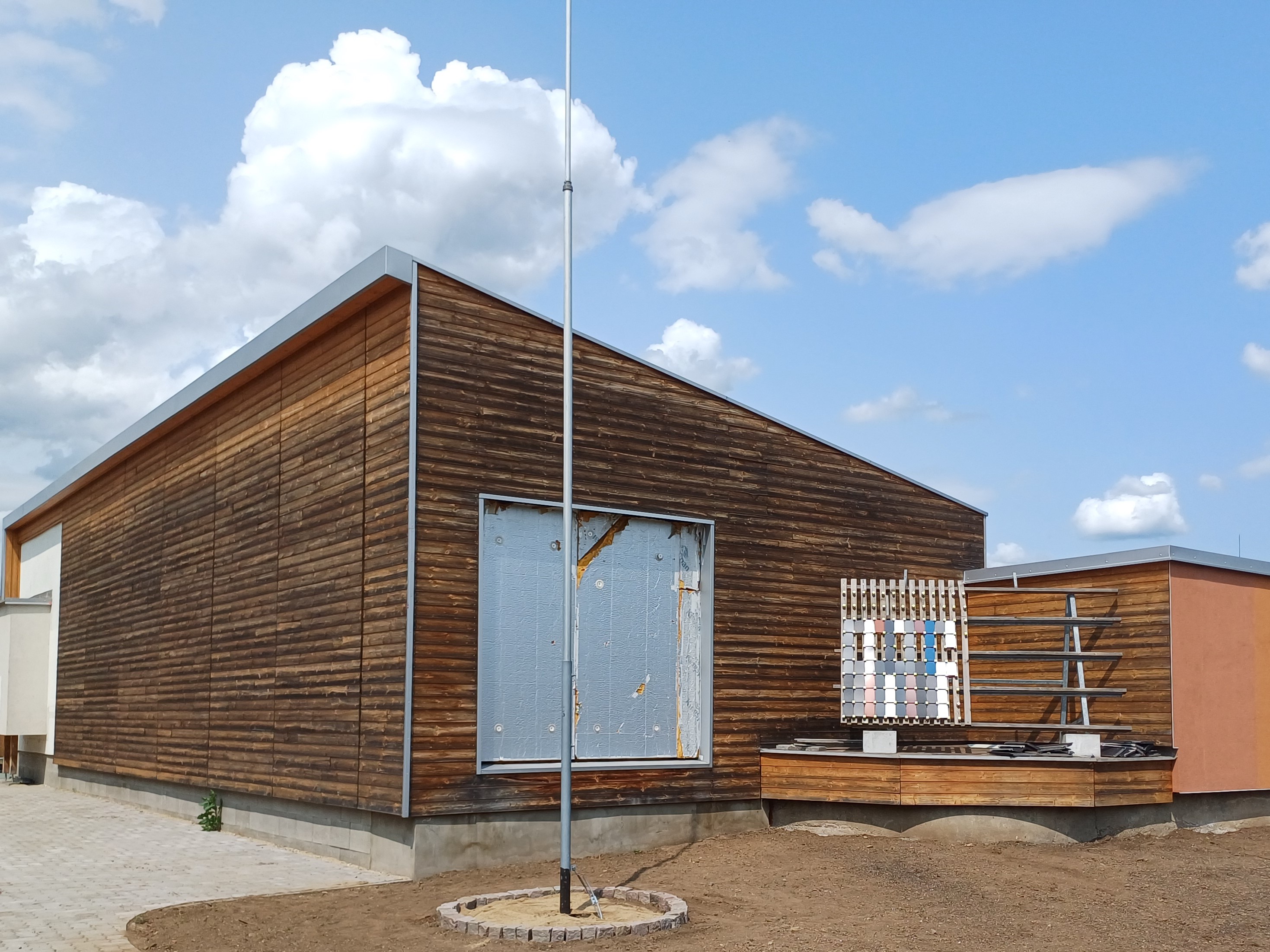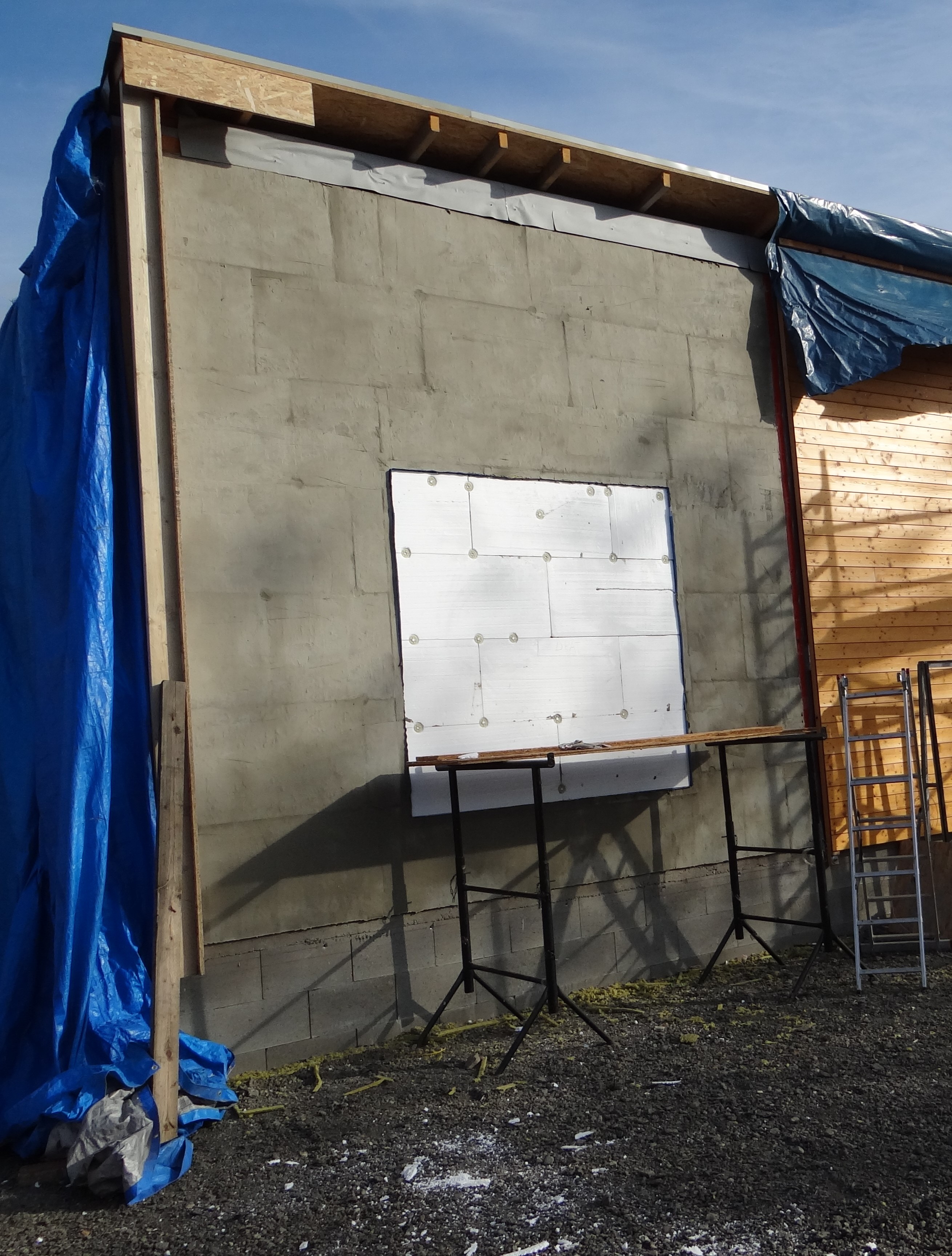 Na fasádách objektu jsou osazeny vzorky omítek pro ETICS různých výrobců, barev a technologií.