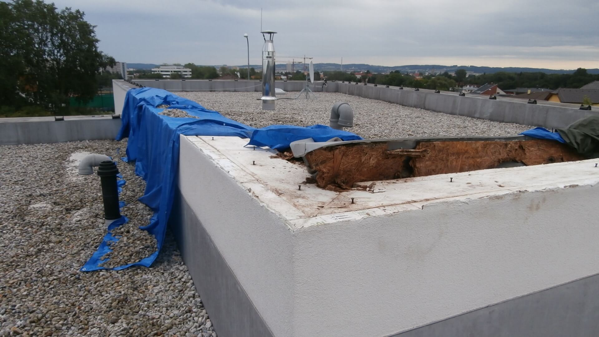 Popis zjištěné poruchyV roce 2017 jsme měli hledat příčiny havárie větrem utržené části koruny atiky ploché střechy rodinného domu, ke které došlo už po třech letech od zahájení provozu. Majitel a uživatel objektu nezaznamenal před havárií v interiéru žádné viditelné poruchy. OSB deska použitá pro vytvoření rovného, tuhého a únosného podkladu koruny atiky byla ztrouchnivělá, zcela nesoudržná ve své hmotě a její stav byl označen za hlavní příčinu havárie detailu. Všichni zúčastnění se ptali: „Jak je možné, že OSB deska je po třech letech od zabudování v tak katastrofálním stavu?“ Řešení problému se ujali kolegové ze znaleckého ústavu DEKPROJEKT s.r.o.