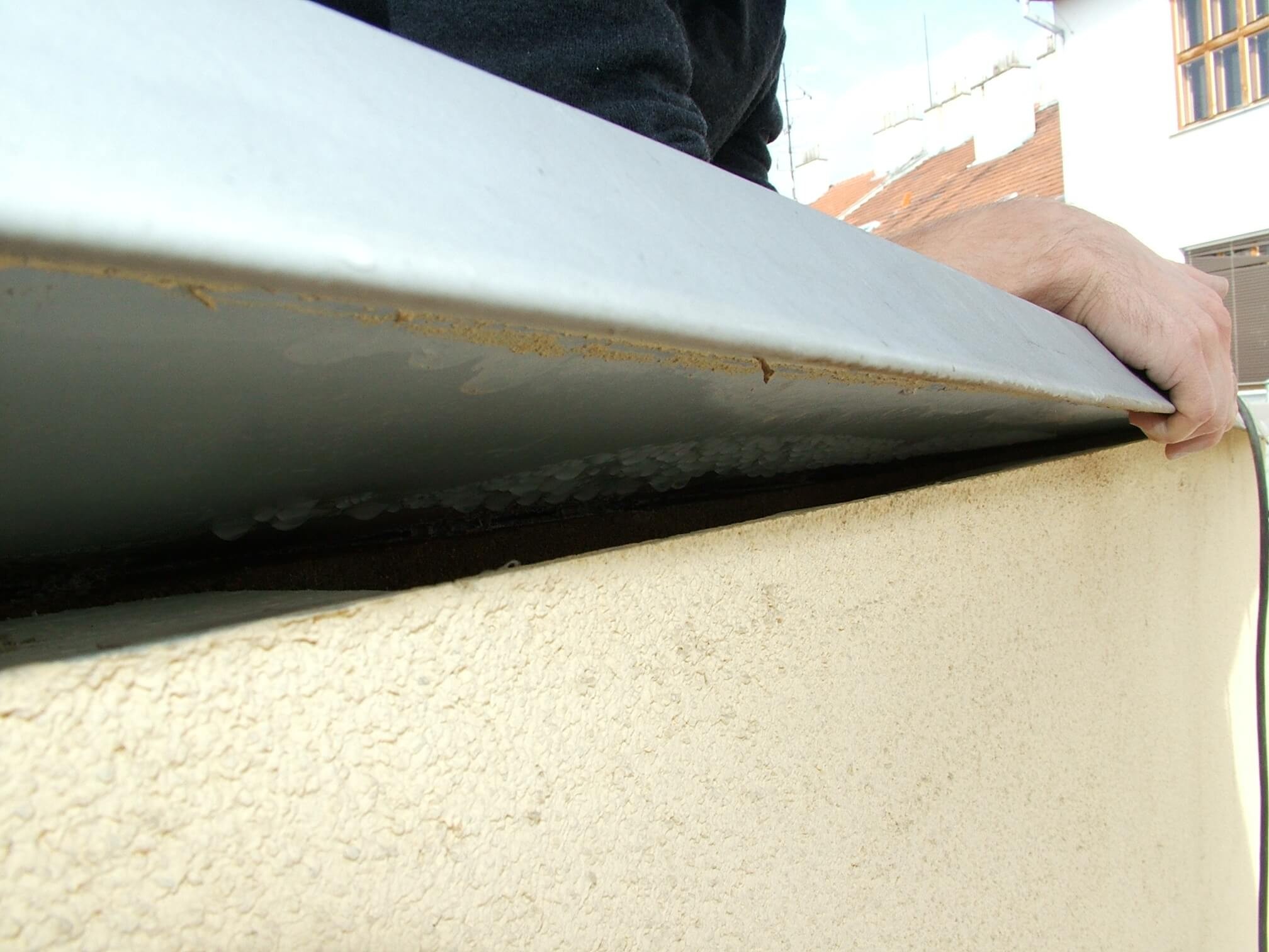 Touto cestou může pronikat poměrně velké množství vlhkosti až k oplechování atiky, kde může zkondenzovat a zatěžovat konstrukční prvky detailu kapalnou vodou, jak je zobrazeno na fotografii 4, získané na jiné stavbě.