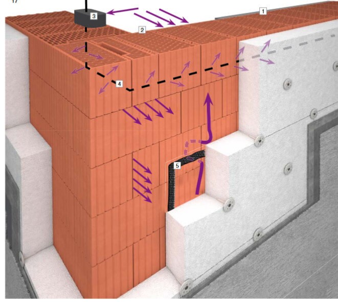 Příčina 2 - Do konstrukce atiky byla vlhkost transportována netěsnými obvodovými konstrukcemi.Analýza možných vad a poruch konstrukcí způsobených prouděním vzduchu v obvodových konstrukcích byla podrobně provedena v časopisu DEKTIME 03/2014 v článku Vlhkostní poruchy způsobené nevzduchotěsnou obálkou staveb. V této analýze se poukazuje jak na riziko transportu vlhkého vzduchu nevhodně provedeným neomítnutým zdivem z dutinových cihelných bloků, tak na možnost transportu vlhkého vzduchu mezi novým zdivem a nevhodně provedeným zateplením z ETICS, jak je schématicky znázorněno na obrázku 2.