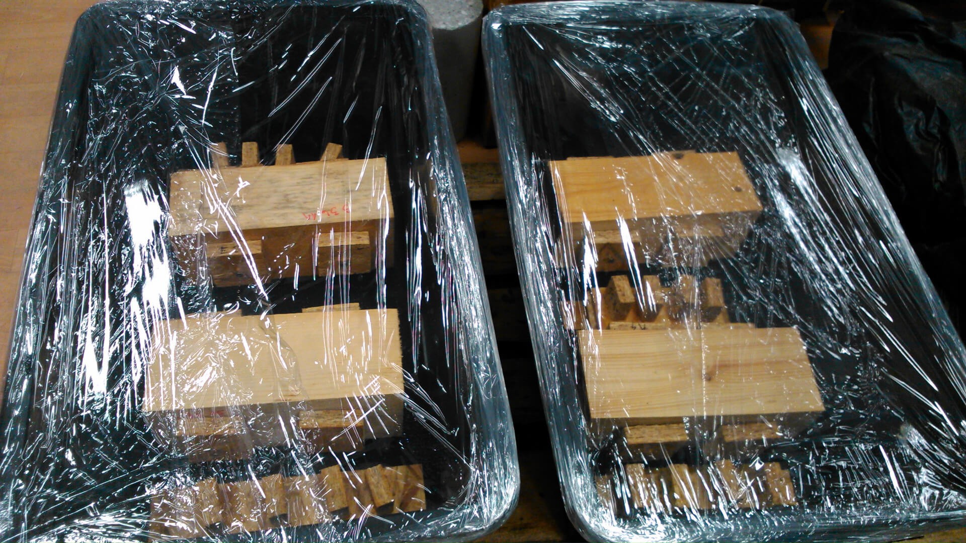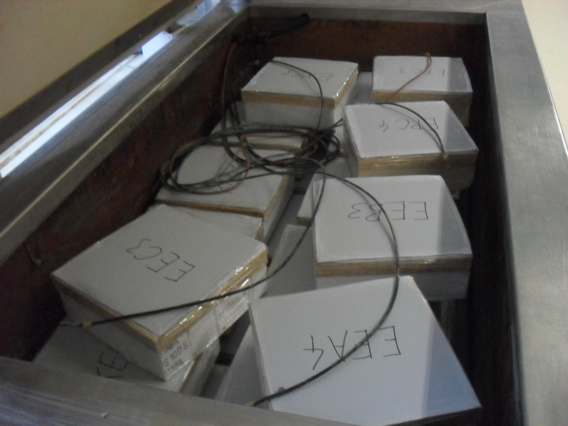 Série podobných poruch, se kterými jsme se v poslední době setkali jak prostřednictvím konzultačních techniků ATELIERU DEK působících v jednotlivých regionech, tak v rámci činnosti znaleckého ústavu, byla důvodem k zahájení výzkumného úkolu řešeného na Fakultě stavební Technické univerzity v Ostravě na katedře stavebních hmot a diagnostiky staveb. Řešitelem úkolu je Ing. Ondřej Nečas. Při řešení úkolu byly zahájeny rozsáhlé experimentální testy kvality a parametrů deskových materiálů vystavených vysoké vlhkosti, jak je zobrazeno na fotografiích 8 a 9. Součástí testů je i zjišťování únosnosti vrutů ve zkoušených deskových materiálech uložených v různých vlhkostních podmínkách, viz fotografie 10 a 11.