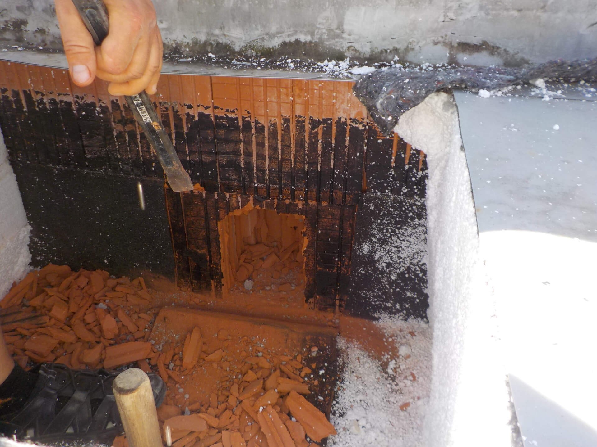Aby bylo možné příčinu 2 potvrdit nebo vyloučit, byly provedeny sondy do atikového zdiva ze strany střechy.