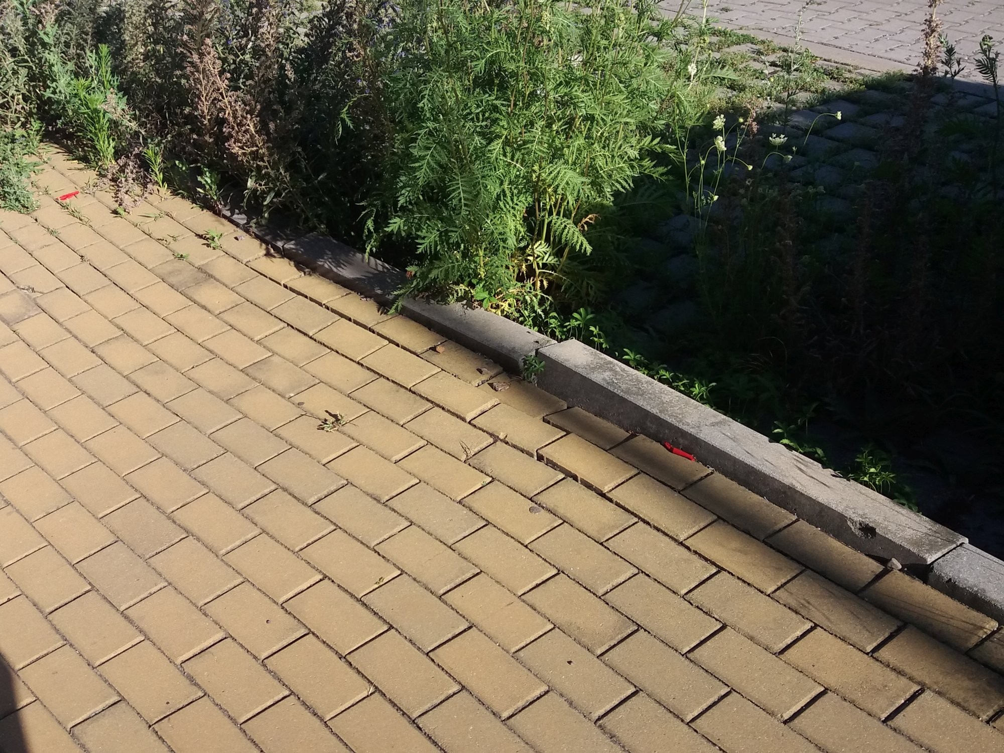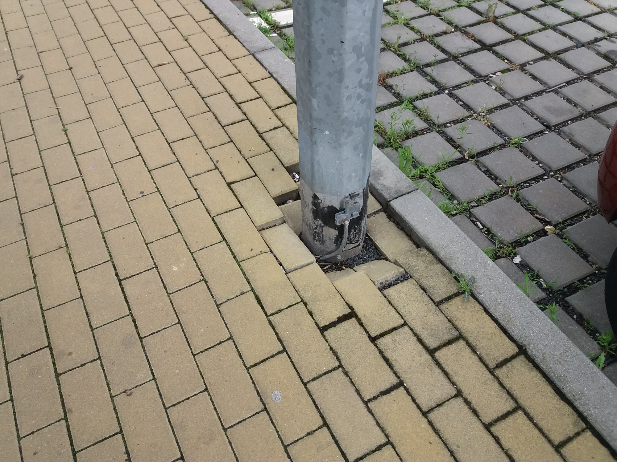 5 a 6 - Po dokončení chodníku se propadla dlažba kolem sloupu veřejného osvětlení i nad vedením přívodního kabelu. Další defekty se vyskytují podél obrubníku.