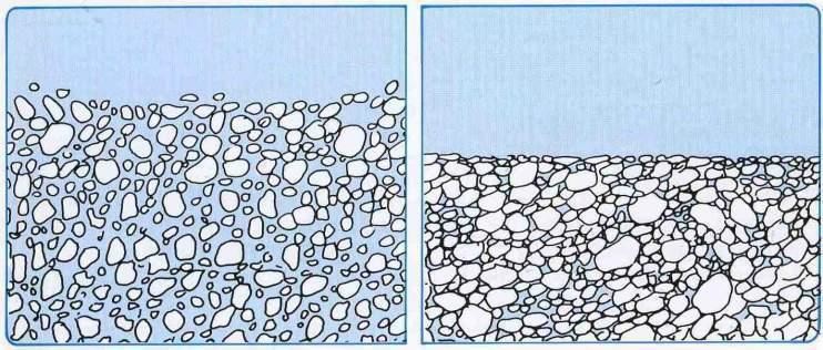 Průběh a výsledek hutnění závisí především na druhu zeminy, zrnitosti zeminy a obsahu vody v zemině. Vliv obsahu je na následujících schématech.