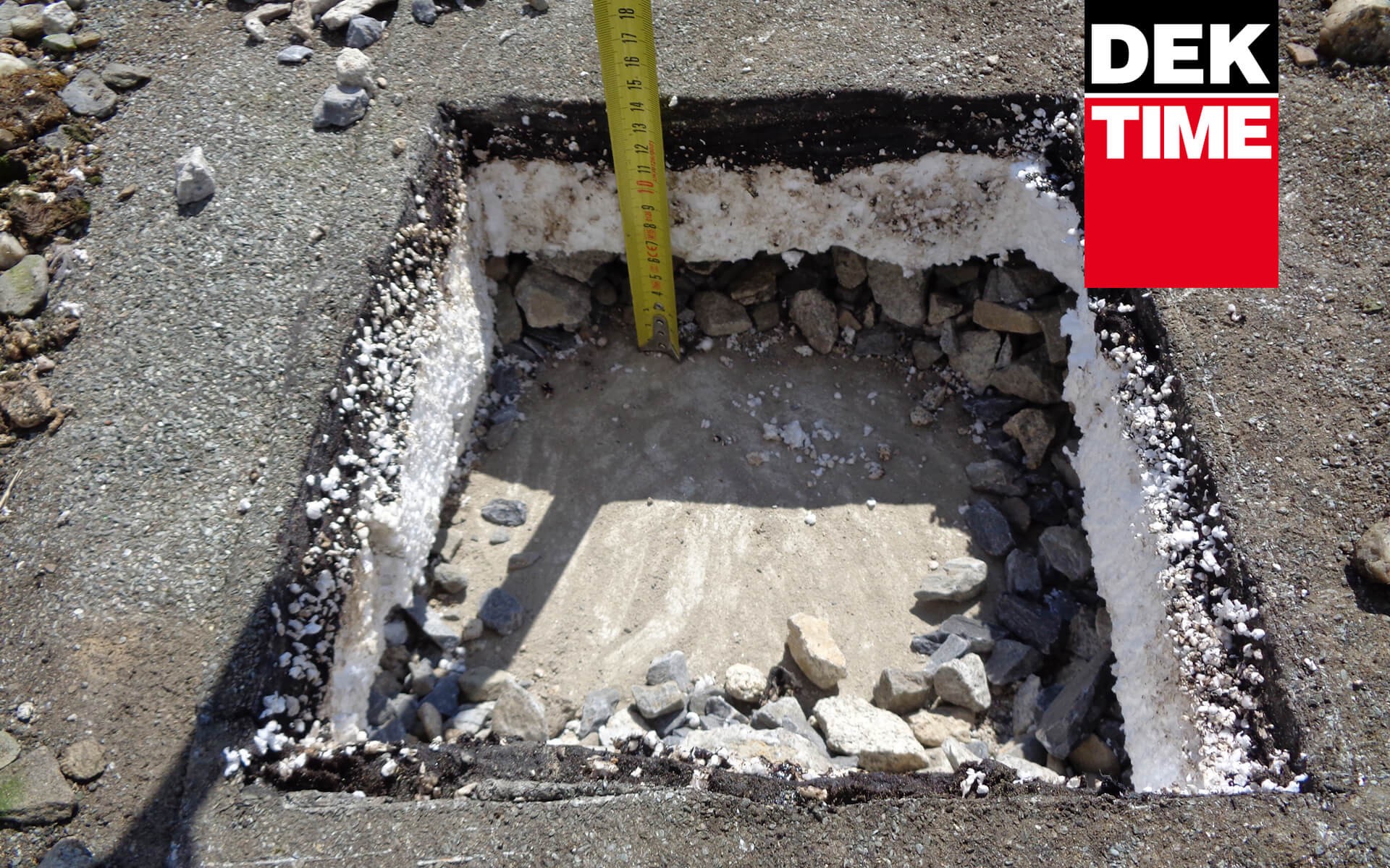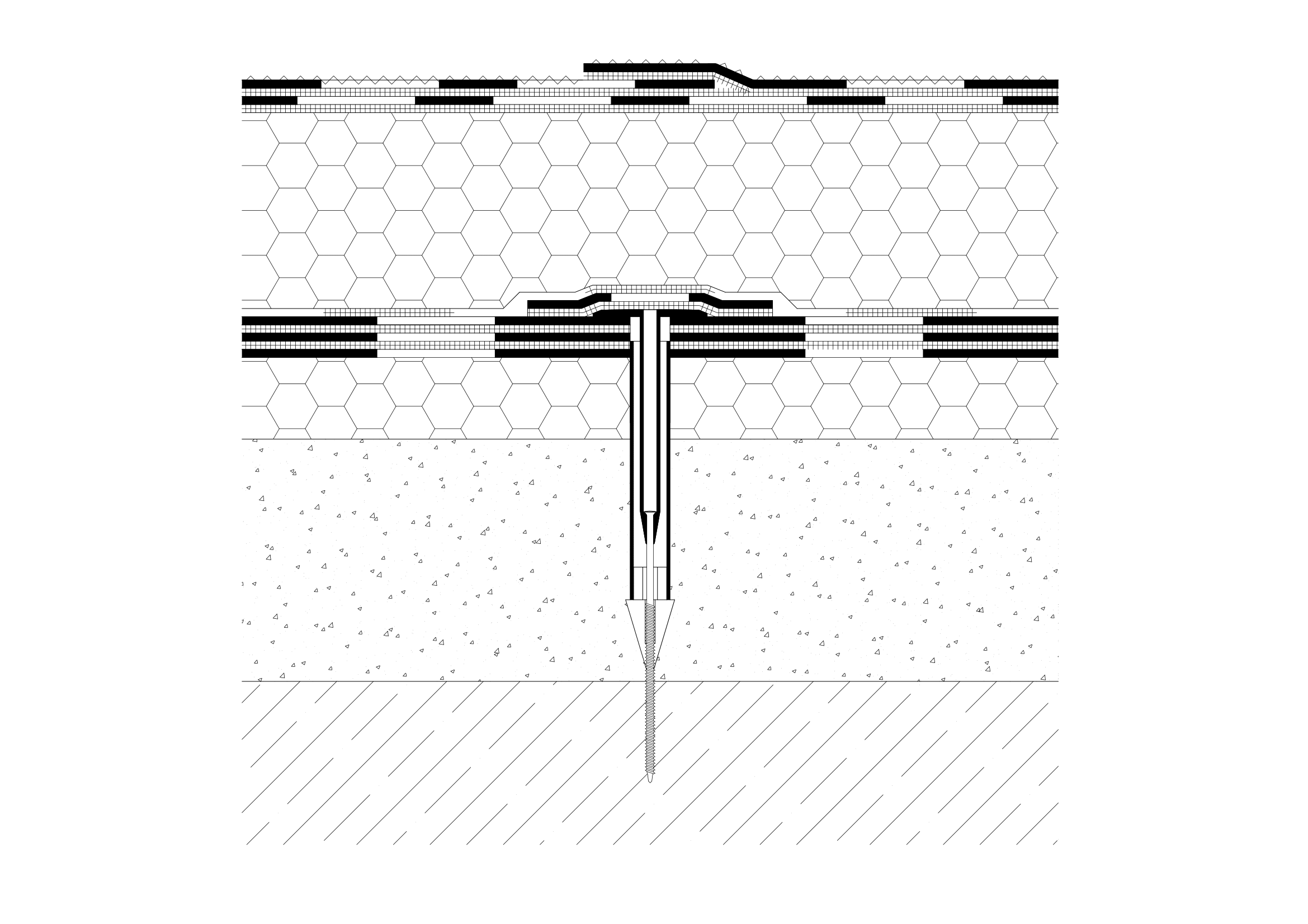 Princip technického řešení Vrtací soupravy DEK (viz obr. 13) spočívá v zavrtání trubkové chráničky do vrstvy násypu. Chránička zabrání zasypání předvrtaného otvoru a umožní tak přikotvení stávajícího asfaltového souvrství k podkladu standardní technologií za pomoci šroubu do betonu s plastovým teleskopem. Přikotvením stávající krytiny z asfaltových pásů získáme stabilní podklad pro realizaci nových vrstev lepením (obr. 19). Před realizací nových lepených vrstev je třeba ještě přířezem asfaltového pásu zapravit hlavy kotev, aby původní asfaltové pásy mohly plnit v nové skladbě funkci parozábrany a nedošlo k zatečení do střešního pláště během realizace. Popis jednotlivých kroků mechanického kotvení starého souvrství je na obr. 14–18. Systém rekonstrukce střechy s využitím Vrtací soupravy DEK je navržen tak, aby se v co největší míře využila stará hydroizolace jako parozábrana a po dobu rekonstrukce se uplatnila její hydroizolační funkce. Proto se kotví pouze staré souvrství a nové se lepí, aby chráničky po zavaření záplat nad nimi neperforovaly původní hydroizolaci = budoucí parozábranu.