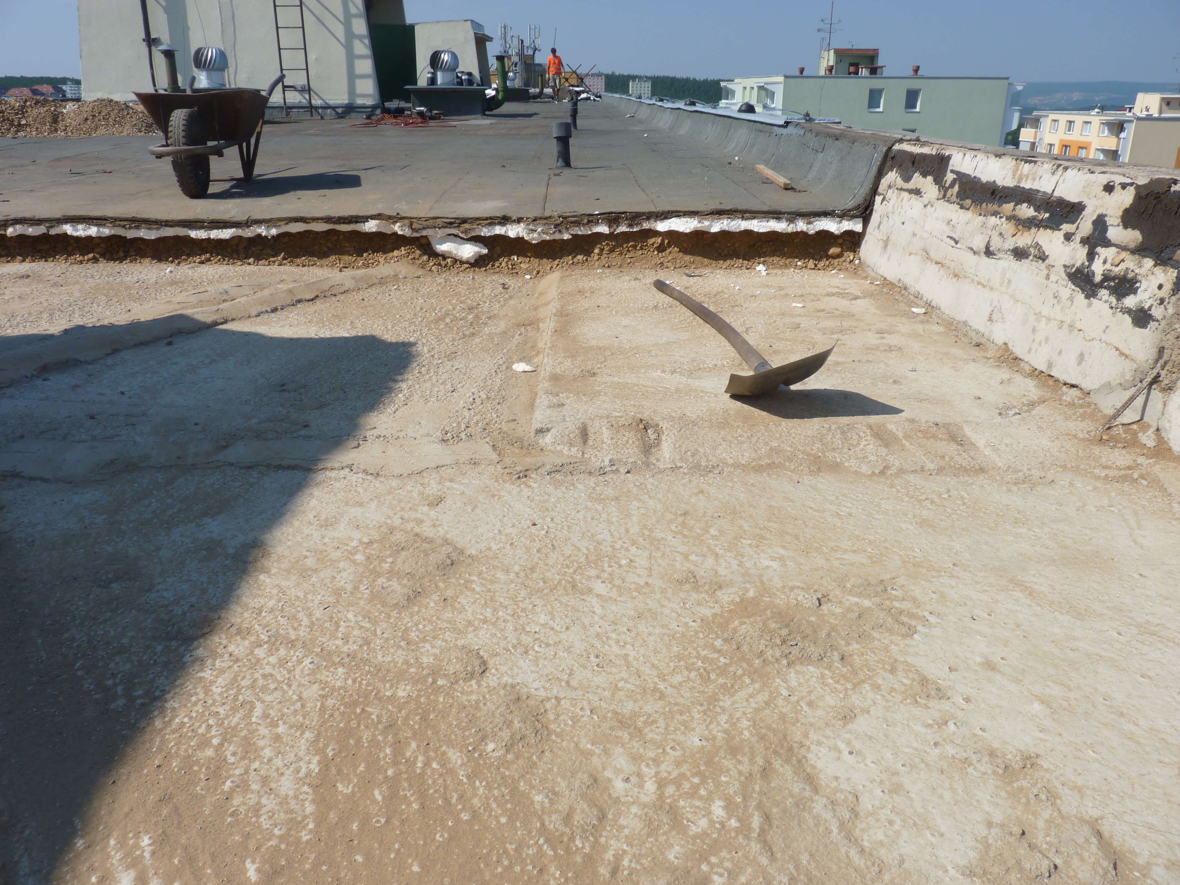 Tento způsob rekonstrukce je velmi nákladný a pro investora často neakceptovatelný (odtěžení, transport a ekologická likvidace nebo uložení stávajících vrstev na skládku je v mnoha případech nákladnější než samotná realizace nových vrstev střešního pláště). Dále přináší velké riziko zatečení do bytů v průběhu rekonstrukce (obr. 7, 8). Technologické obtíže provázející tento způsob rekonstrukce v podobě nerovného podkladu byly shrnuty v článku Ing. Adama Valy v DEKTIME 01 - 2014 (obr. 5,6). Vzácností není ani vznik trhlin v oblasti kolem okenních otvorů nebo v napojení příček na strop vlivem odlehčení stropní konstrukce.