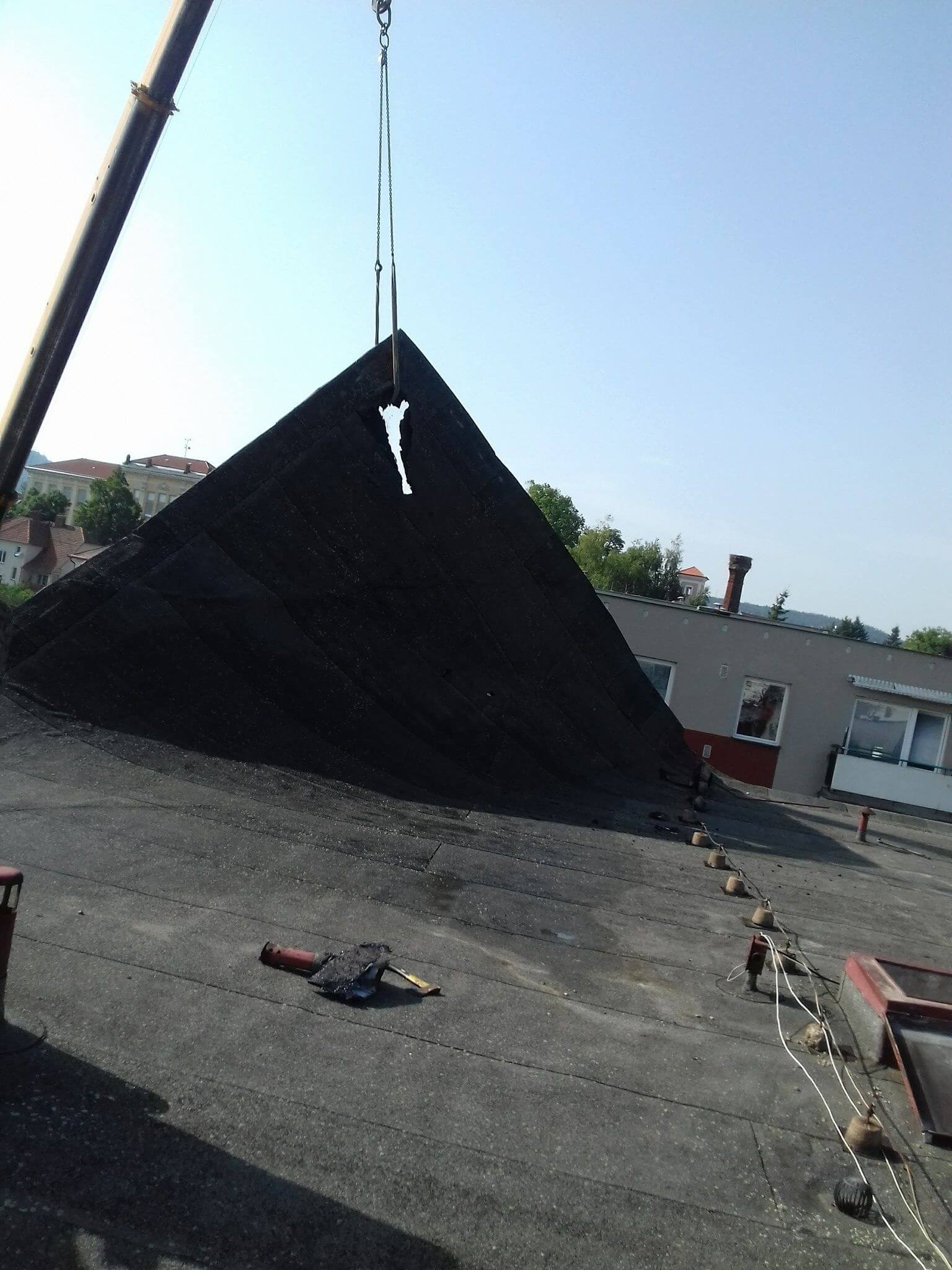 Pracovníci izolatérské firmy by určitě potvrdili, že souvrství hydroizolačních pásů je subjektivně poměrně tuhou a hmotnou vrstvou. Vždyť nebyli schopni bez použití těžké techniky vrátit hydroizolační vrstvu na své původní místo. Přesto tato vrstva svou hmotností nebyla schopna odolat působení větru. A připomínám, že se jednalo pouze o čtyřpodlažní objekt.