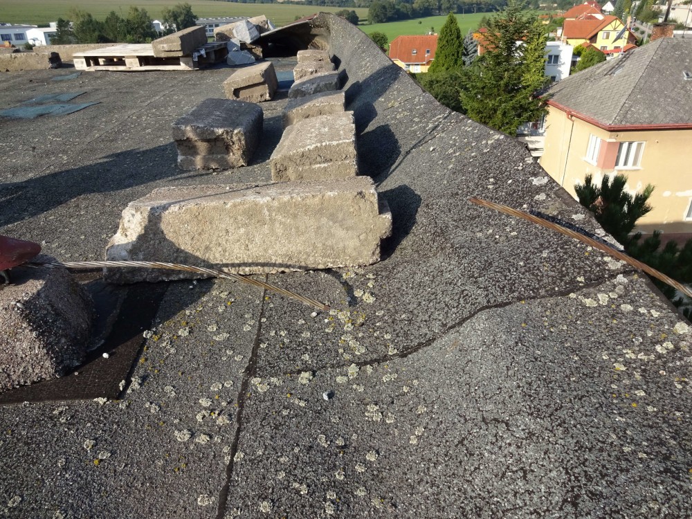 Návrh stabilizace lepením ke stávající hydroizolační vrstvě tak často vychází ze subjektivního předpokladu, že pokud střecha neuletěla za dlouhá desetiletí doteď, tak již neuletí. Položme si otázku, jestli se lze na takový předpoklad bezpečně spolehnout. Odpovědí nechť jsou fotografie ze střechy čtyřpodlažního bytového domu s obdobnou skladbou, u kterého došlo během letní bouřky k částečnému utržení hydroizolace z asfaltových pásů natavených na podklad z plynosilikátových tvárnic. Lokálně došlo i k vytržení plynosilikátových tvárnic (obr. 09, 10). Překážkou nebyl ani drát hromosvodu (obr. 11).