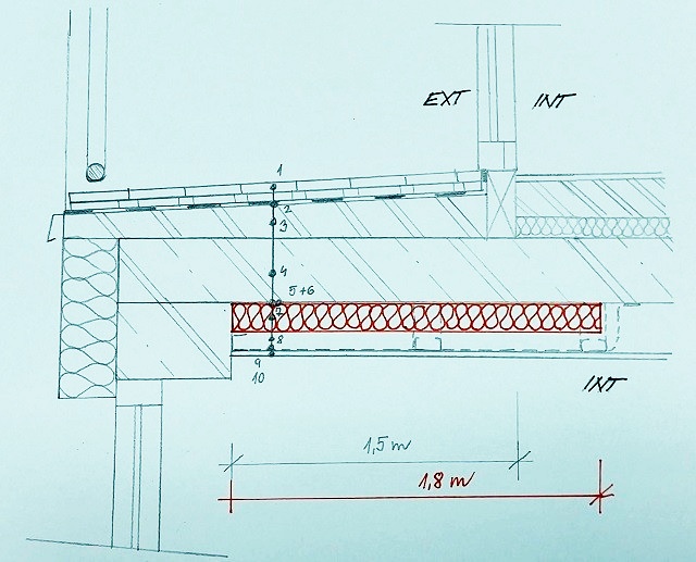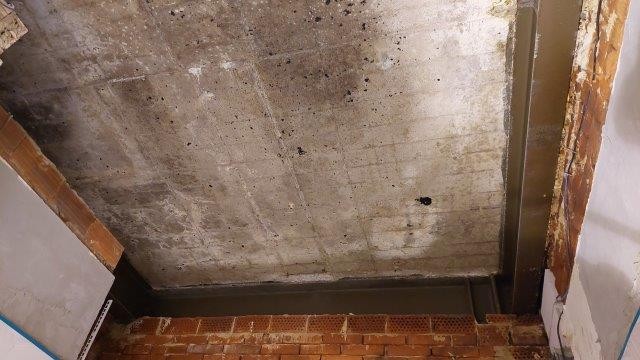 První problematická skladba se nacházela nad kuchyní baru v areálu plaveckého bazénu. Zde, nad sníženým sádrokartonovým podhledem, docházelo k masivní kondenzaci. Skladba provozní střechy vypadala následovně (od exteriéru):