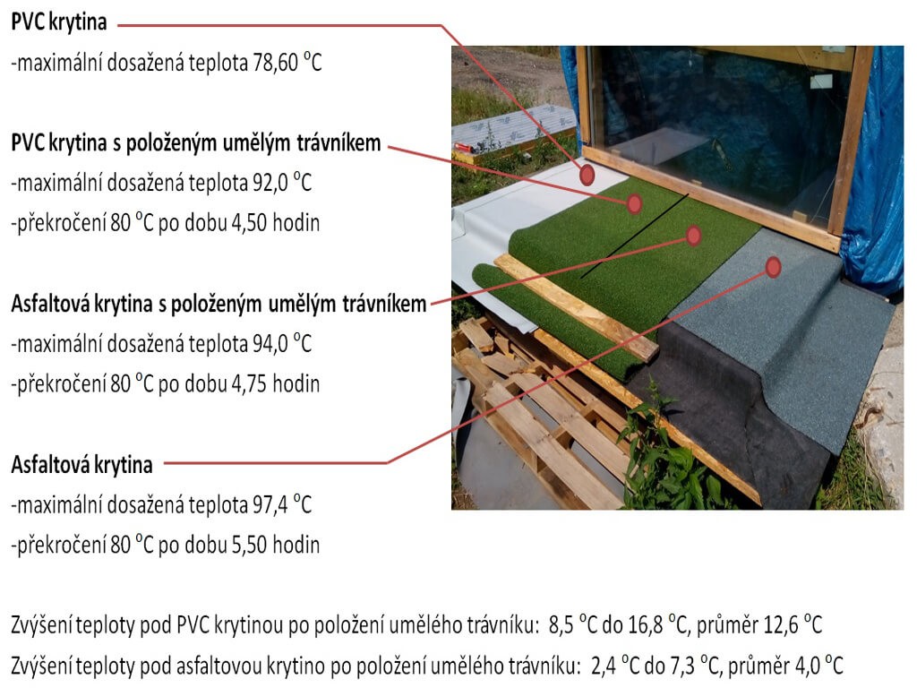 Měření na těchto dvou skladbách probíhalo do 5. srpna, kdy na polovinu obou hydroizolací byl položen travní koberec z umělé hmoty. V této části pokusu se měl ověřit vliv zvýšeného teplotního namáhání a následné degradace EPS po položení umělého trávníku na povrch střechy.