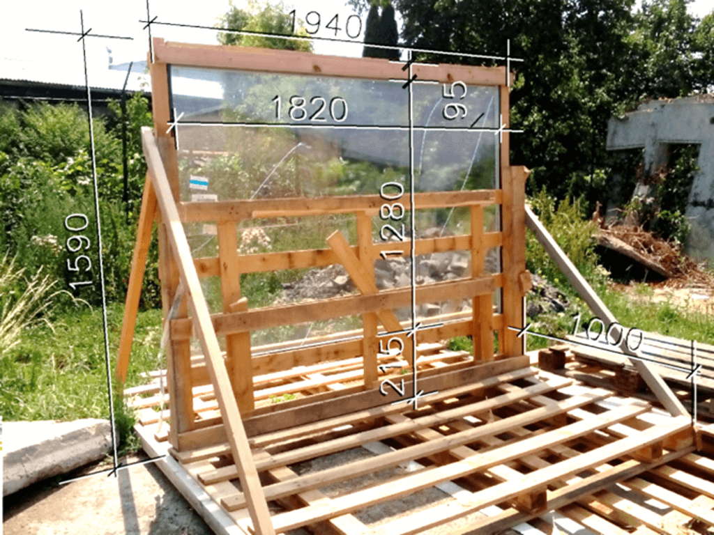První den realizace byl postaven skelet modelu se základnou z dřevěných EURO palet a skeletovou konstrukcí stěny a zavětrování z dřevěných latí profilu 40x60 mm. Do připraveného modelu byla osazena bezrámová výplň s izolačním trojsklem o šířce 1 820 mm a výšce 1 280 mm s distančním rámečkem vysokým 10 mm. Pro zatížení modelu byly použity betonové dlaždice formátu 500x500x50 mm. Po osazení zasklení a zatížení modelu bylo provedeno vyrovnání stěnové konstrukce do svislé roviny. Stěnová konstrukce byla vytvořena tak, aby po osazení skladby modelové ploché střechy byla výška parapetu 60 mm.