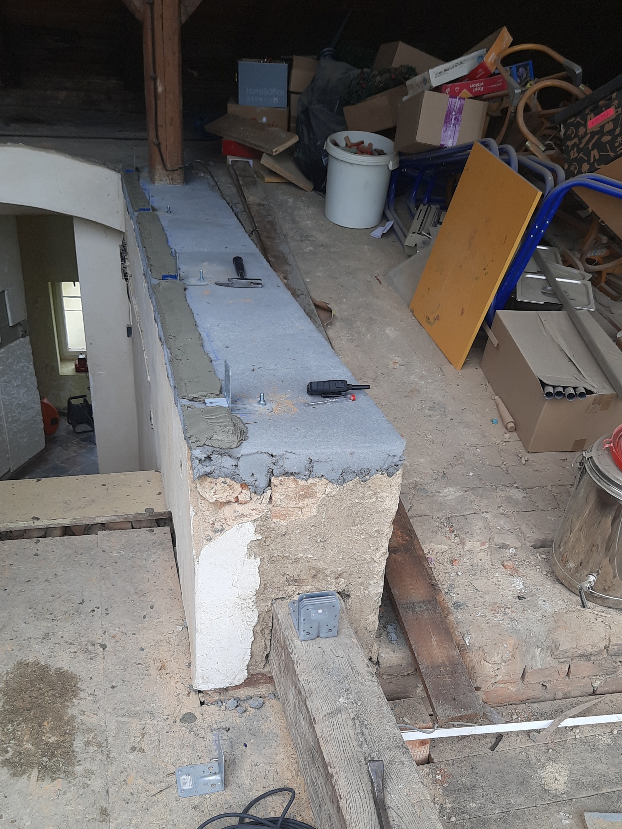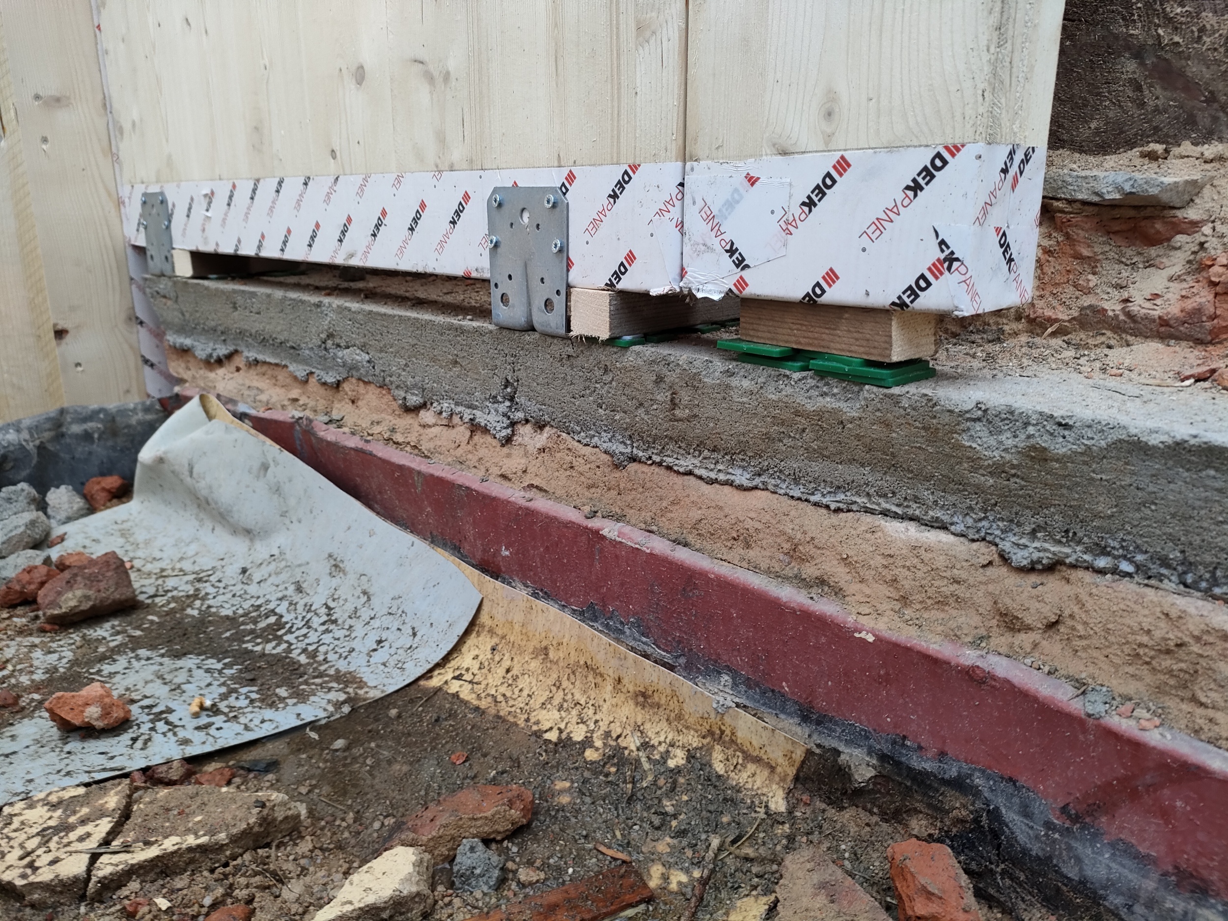 Před montáží panelů bylo třeba připravit podklad. Nejprve se odstranila skladba ploché střechy a atika. Stropní deska se po odstranění skladby střechy provizorně zakryla. Následně se provedlo zaměření původního stavu a vytyčení nového betonového věnce v části ploché střechy pro usazení panelů. Nástavba se prováděla na ploché střeše a částečně zasahovala do prostoru zakrytého šikmou střechou na dřevěném krovu. Do původního krovu se nezasahovalo až do dne montáže. Den před realizací si pracovníci zaměřili půdorys a výškově usadili ocelové úhelníky (Obr. 7). Výškový rozdíl mezi podlahou půdy a betonovou deskou ploché střechy byl přibližně 0,5 m.