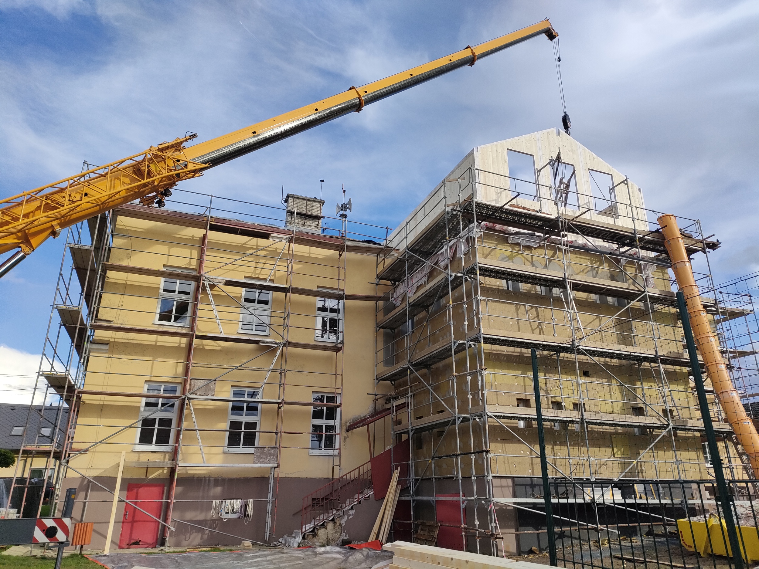 V tomto článku se zaměříme na řešení nástavby objektu ZŠ a MŠ v obci Suché Lazce na Opavsku. Vedení školy potřebovalo novou hernu a nabízela se nástavba na ploché střeše s napojením do původního krovu (Obr. 1). Architekt pro své řešení zvolil variantu montované dřevostavby ze systému DEKPANEL.