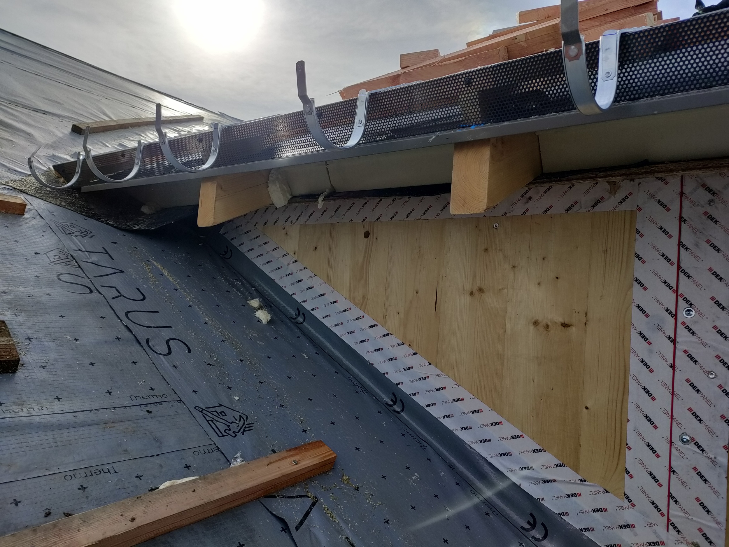 Před položením pozednic a vaznice se provedla kontrola polohy panelů. Krokve se na pozednici a vaznici napojovaly svými tvarovanými konci do vyfrézovaných rybinových kapes (Obr. 14, 15). Následně se provedl záklop z OSB desek do napojení úžlabí s původním krovem (Obr. 16, 17).