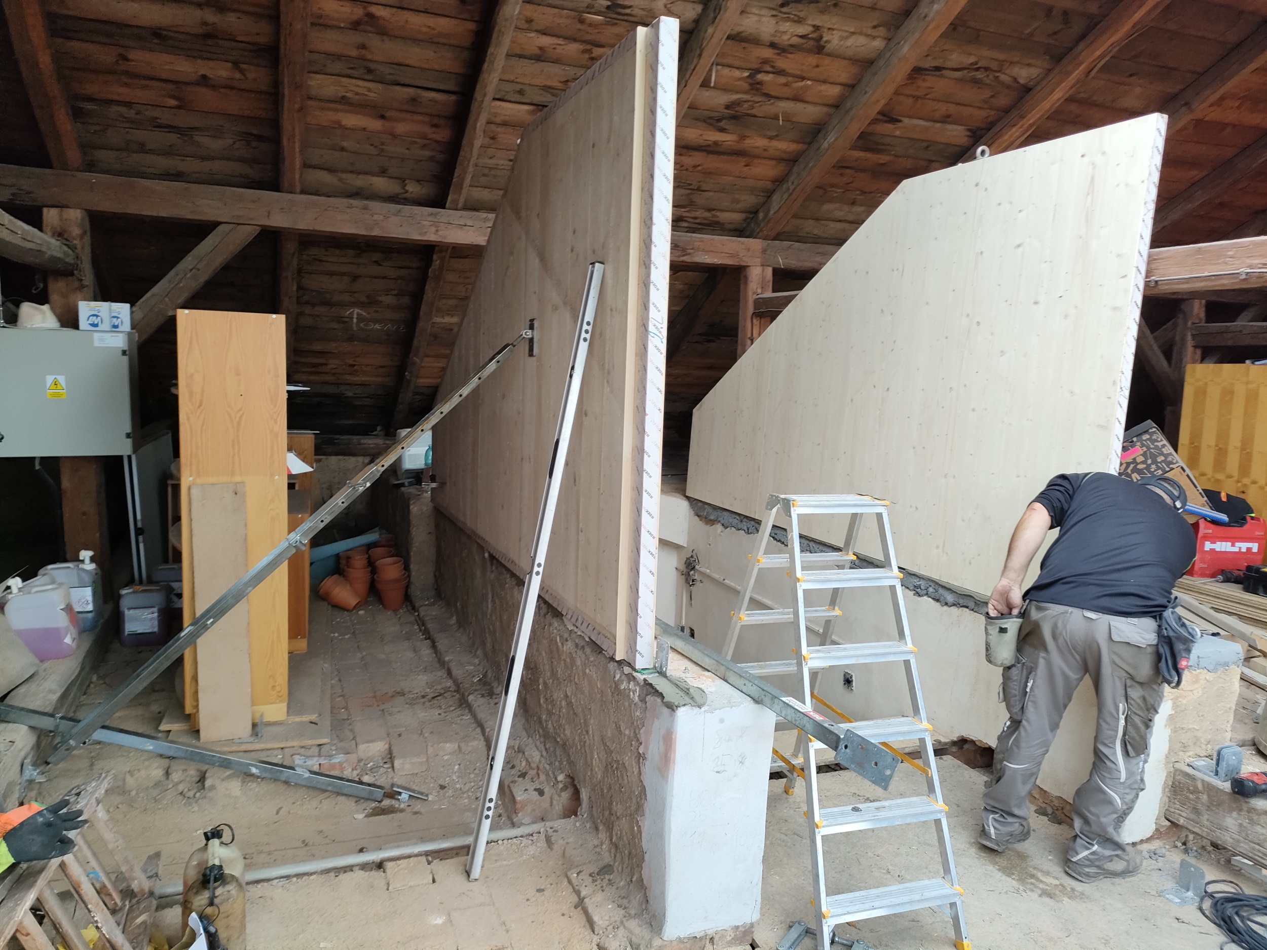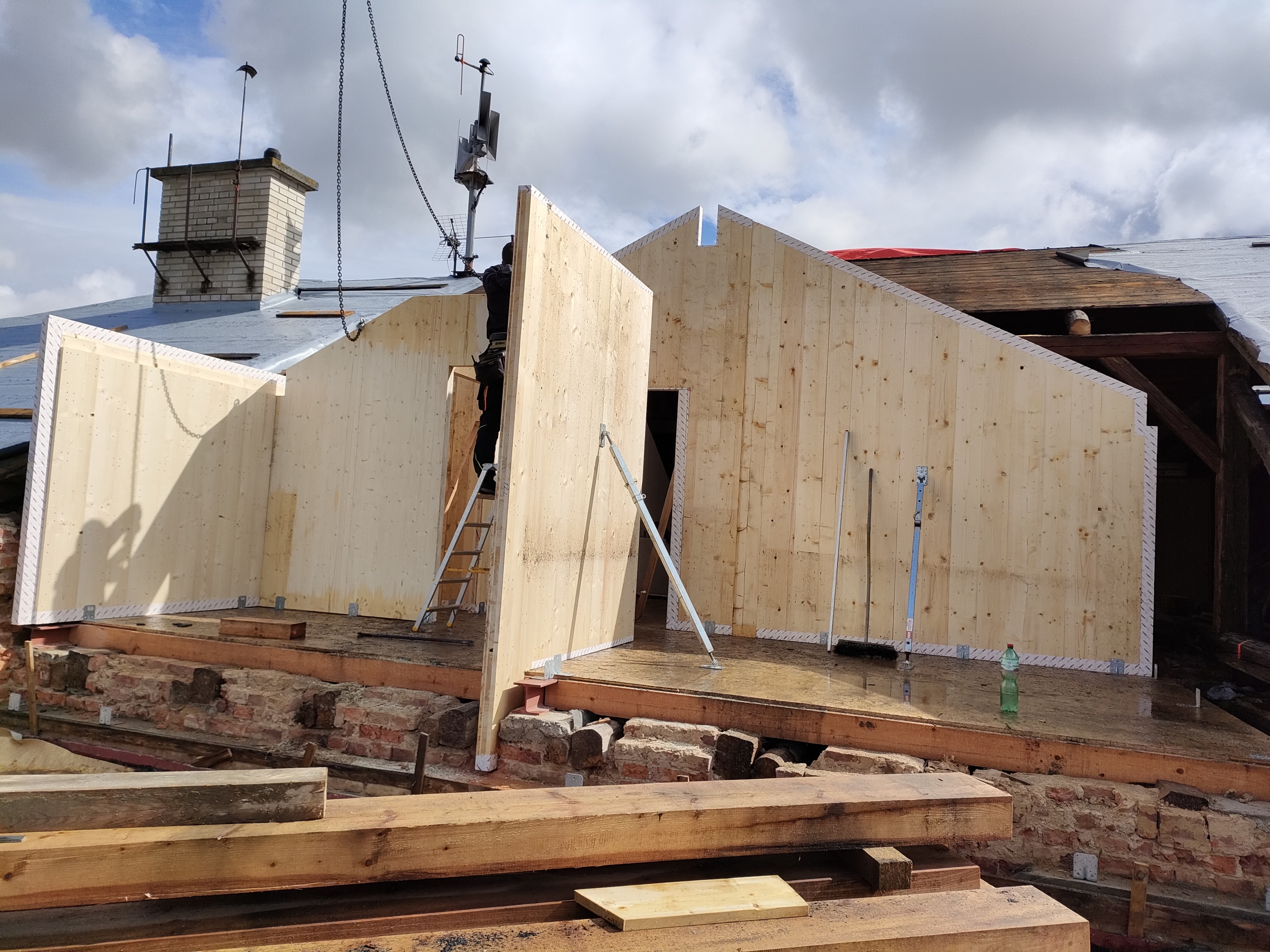 Panely se začaly usazovat od prostor pod šikmou střechou. Před montáží se odkryla část střechy, odstranilo bednění a vyřezaly krokve (Obr. 7). První panely se osazovaly pod část střechy, která se neodstraňovala. Bylo tedy třeba je namontovat manuálně. Výškově se poloha panelů vymezila plastovými podložkami . Do vytyčené půdorysné polohy se k podkladu připevnily ocelové úhelníky 90x105x105 s prolisem. Na zdivu a na betonovém podkladu se panely usadily do výplňové malty Fermacell (Obr. 8). Následně se panely k úhelníkům ukotvily vruty do dřeva RAPI-TEC 5x50/45. Ve svislé poloze se panely zajistily provizorními rozpěrnými tyčemi (Obr. 9). Po vzájemném spojení panelů ve svislých spárách do přiměřeně stabilních celků se rozpěrné tyče odstranily a použily se pro montáž dalších panelů.