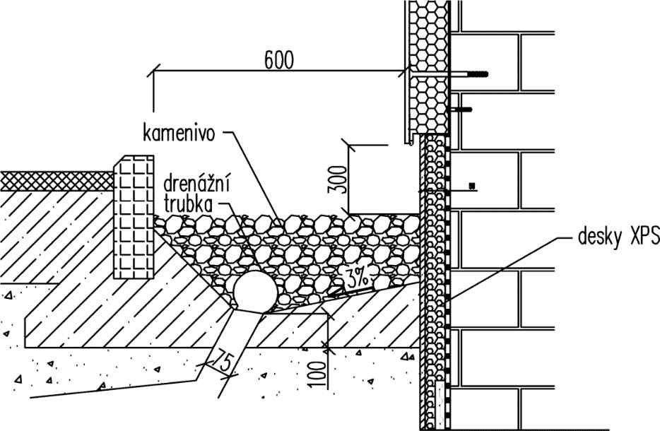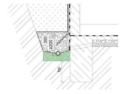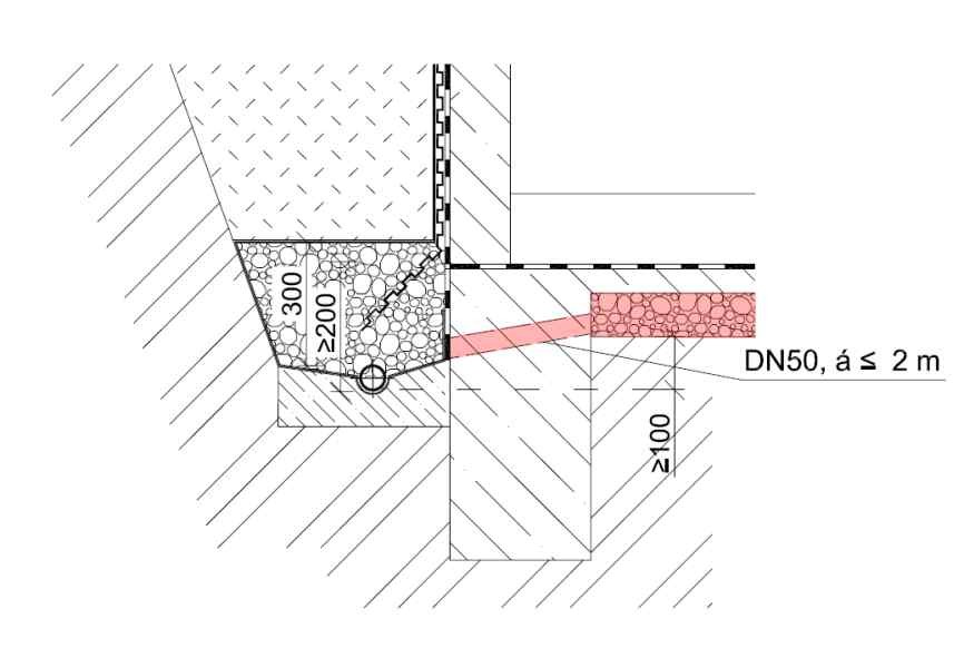 Obr. 18 Schéma paty obvodové drenáže s propustným podkladem (hydroizolace je zakreslena schematicky) [14]