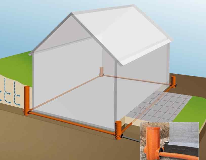 Odvod vody od chráněných svislých konstrukcí staveb se realizuje pomocí plošných drenáží zaústěných do svodných obvodových liniových drénů nebo do plošné drenáže pod objektem. Převedení vody mimo objekt lze provést:
