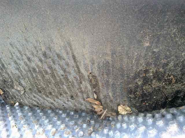 Obr. 6 Poškození hydroizolace zatlačením nopů profilované drenážní fólie, která nebyla oddělena ochrannou textilií, umocněné sedáním zeminy při hutnění zásypu jámy