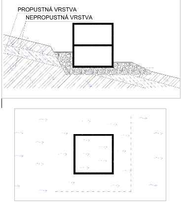 Obr. 4 Podtokem kombinací plošných a liniových drénů (nahoře řez, dole půdorys)
