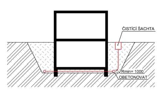 Dále je možné v rohu objektu vynechat šachtice, pokud je drenážní potrubí vyvedeno tak, aby bylo možné s čisticí a inspekční technikou provádět kontrolu a čistění z povrchu terénu, jak je znázorněno na Obr. 24. Výklenky šířky do 2 m lze považovat za součást stěny, pokud nejsou na návodní straně.