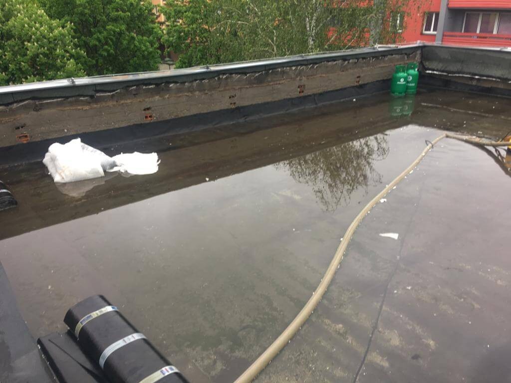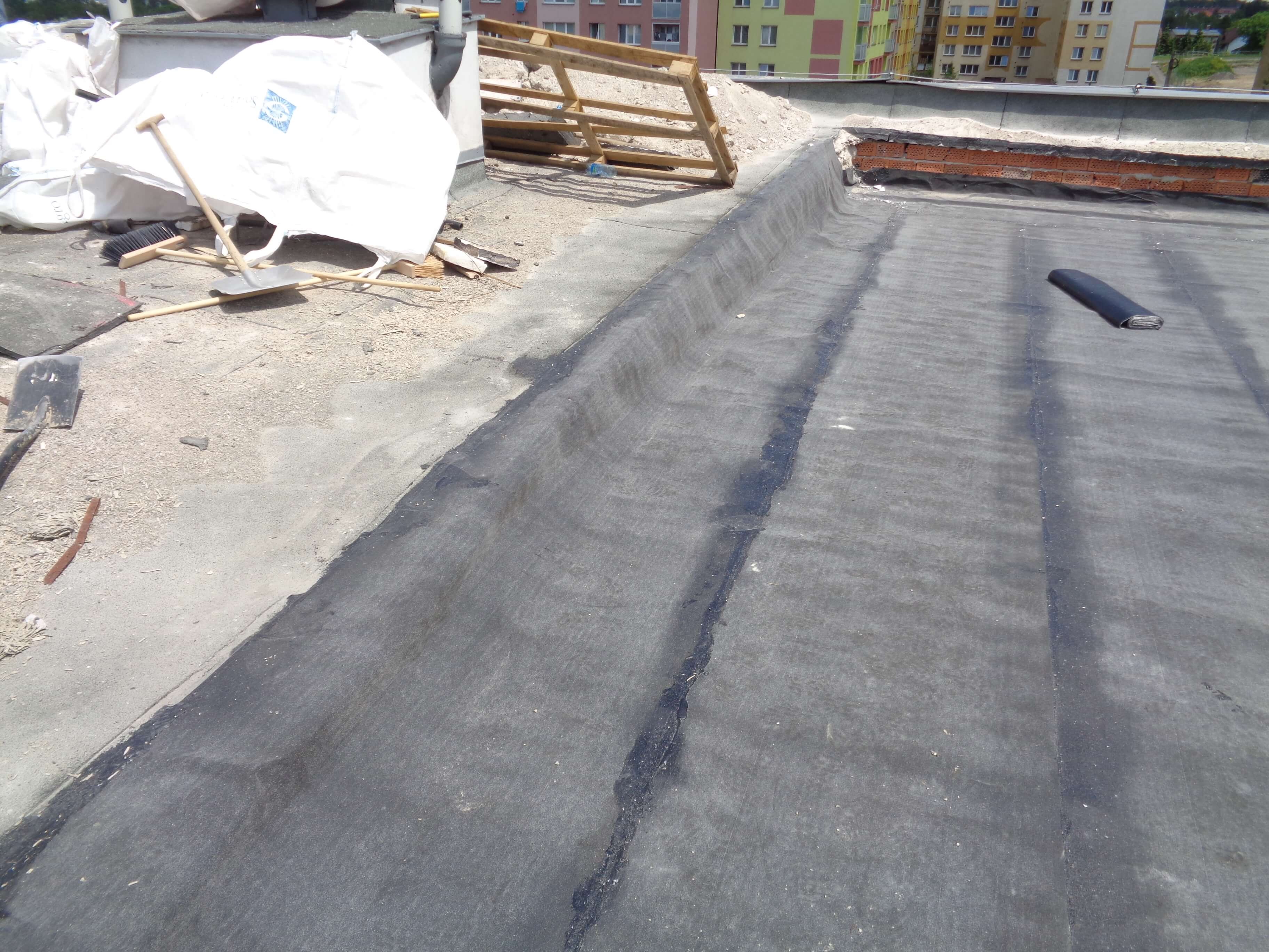 Na násypu byly položeny desky z heraklitu, desky POLSID z polystyrenu (foto 2) a několik vrstev asfaltových pásů. Vrstva násypu u atik byla vysoká až 400 mm (foto 3). V násypu se nacházely také cihly, které v minulosti tvořily systém větracích kanálků (foto 4). Odstraňování starých vrstev střechy probíhalo po etapách. Ihned po odtěžení vrstev se na nosné konstrukci prováděla provizorní hydroizolační vrstva z asfaltového pásu (foto 5). Při deštích se na provizorní hydroizolaci tvořily velké kaluže (foto 6). I přes všechna opatření došlo lokálně k zatečení do interiéru bytů (foto 8). Po odtěžení vrstev střechy byly na podkladu nerovnosti až 40 mm (foto 7), se kterými si izolatéři museli při realizaci poradit. S ohledem na deštivé období na jaře 2019 trvalo odstraňování střechy 2 měsíce.