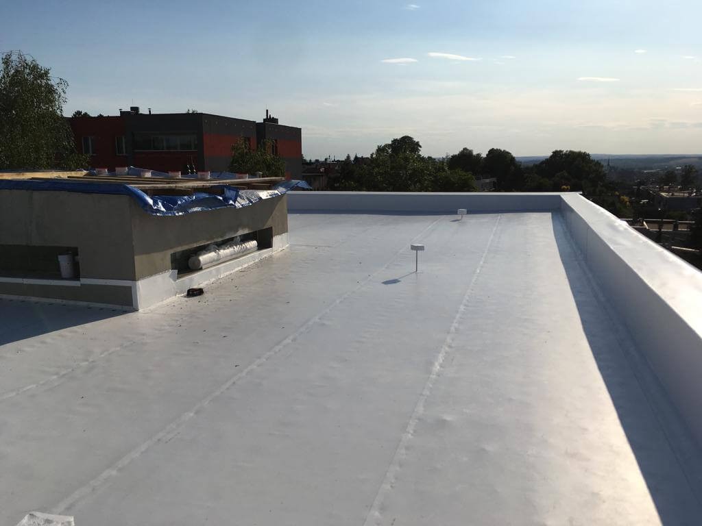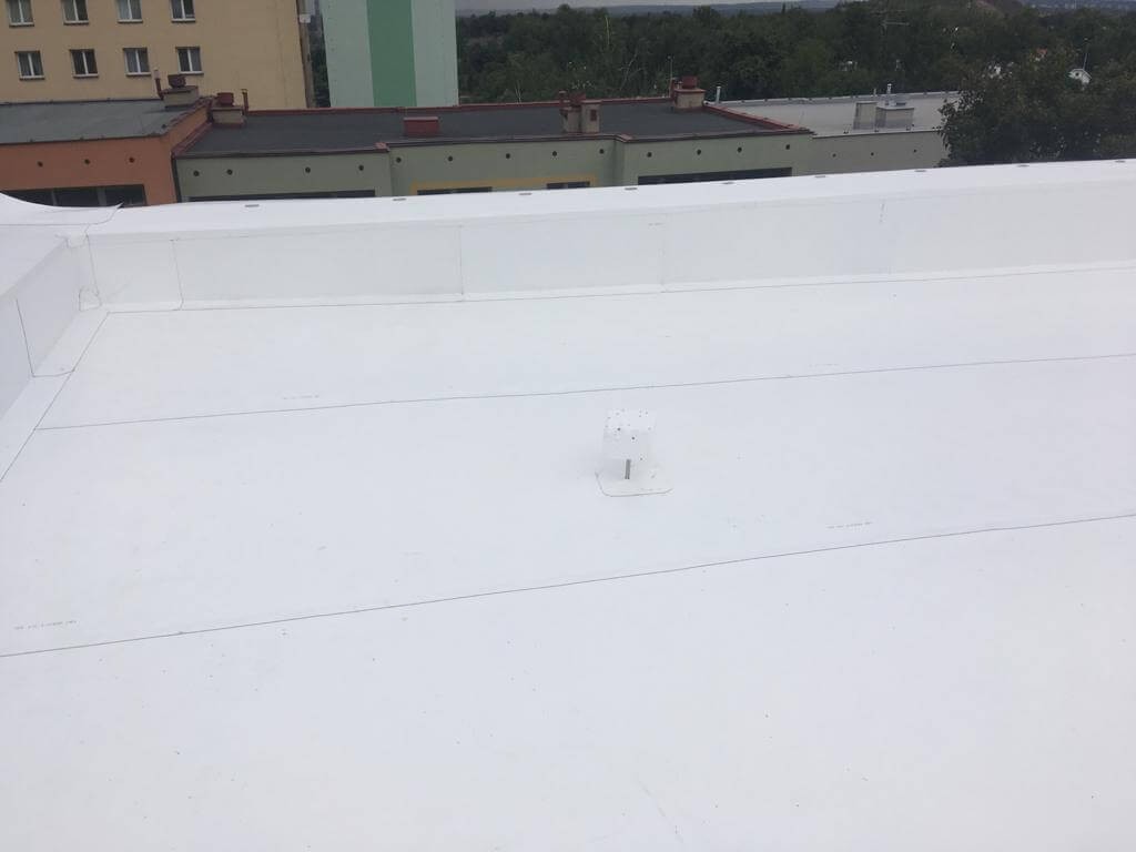 Hlavní hydroizolační vrstva byla provedena z kotvené TPO fólie MAPEPLAN TM (foto 11,12). Byla použita fólie tloušťky 1,5 mm svařovaná horkým vzduchem v přesazích. Kotevní prvek je umístěn ve spoji folií. U TPO fólie není nutné provádět separační vrstvu z textilie od EPS, což si izolatéři pochvalovali. Fólie byla vytažena až na korunu atiky. Tvar hydroizolace v přechodech mezi plochami střechy a atik zajistily lišty z poplastovaného plechu. Na střeše byl proveden také záchytný systém proti pádu osob.