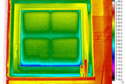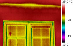 Pro porovnání je na obr. 6 uveden příklad termovizních snímků okna jiného objektu za přirozeného tlaku a za podtlaku bez zásadních netěsností (anomálií) funkční spáry. Téměř u všech výplní otvorů na posuzovaném objektu byly diagnostikovány netěsné funkční spáry, přičemž netěsnosti měly lokální charakter. Tvar a poloha teplotních polí ukazovaly na vyboulené rámy křídel, křídla v rámu vzpříčená nebo vadné těsnění. Některé ze zjištěných nedostatků se obvykle vyskytují při špatně seřízeném kování a lze je dodatečně odstranit. Některé nedostatky lze odstranit výměnou těsnění.