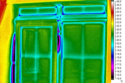 Bylo proto uskutečněno druhé místní šetření, při kterém jsme provedli termovizní měření oken nejprve při přirozeném tlaku a následně při podtlaku v interiéru, který byl vytvořen zařízením blower-door test. Ze získaných snímků bylo patrné, u kterých oken a v jakých místech se nachází výrazné netěsnosti ve funkční spáře, které způsobují značnou infiltraci a tím i značné snížení povrchových teplot na vnitřní straně okna. Na obr. 4 a 5 jsou uvedeny příklady termovizních snímků z hlediska průvzdušnosti vadného okna a vadných balkónových dveří.