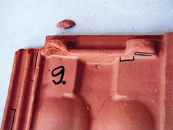 Stejná EN stanovuje na pálených taškách provést v podmínkách použití ČR 150 zmrazovacích cyklů. Taška nesmí po zkoušce vykazovat v normě popsané vady. Přípustné je ale např. odpadnutí závěsu tašky, když alespoň jeden ještě zůstává (obr. 3). Neodpadne ten zbývající hned při dalším cyklu, který se již nedělal? Navíc z normy není zřejmé, jaké období životnosti tašky, v podmínkách užívání, vyjadřuje uvedený počet zmrazovacích cyklů.