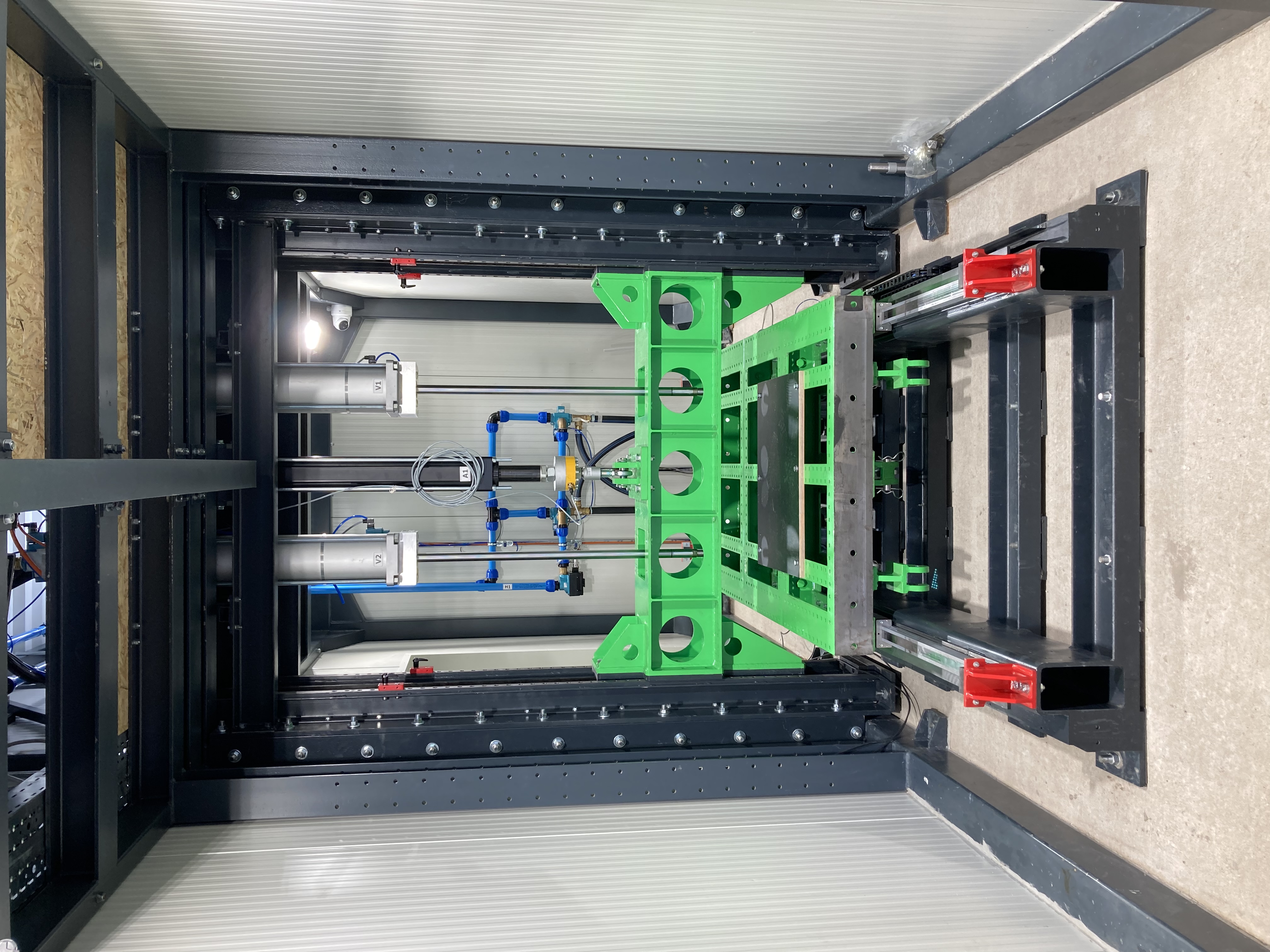 Zkušební zařízení umožňuje v základním nastavení testovat dynamické namáhání ve svislé i vodorovné rovině. Toho je dosaženo kombinací posuvného nosníku ve svislém směru a posuvného stolu ve vodorovném směru. Zkušební zařízení je však uzpůsobeno k zatěžování ve všech možných směrech.