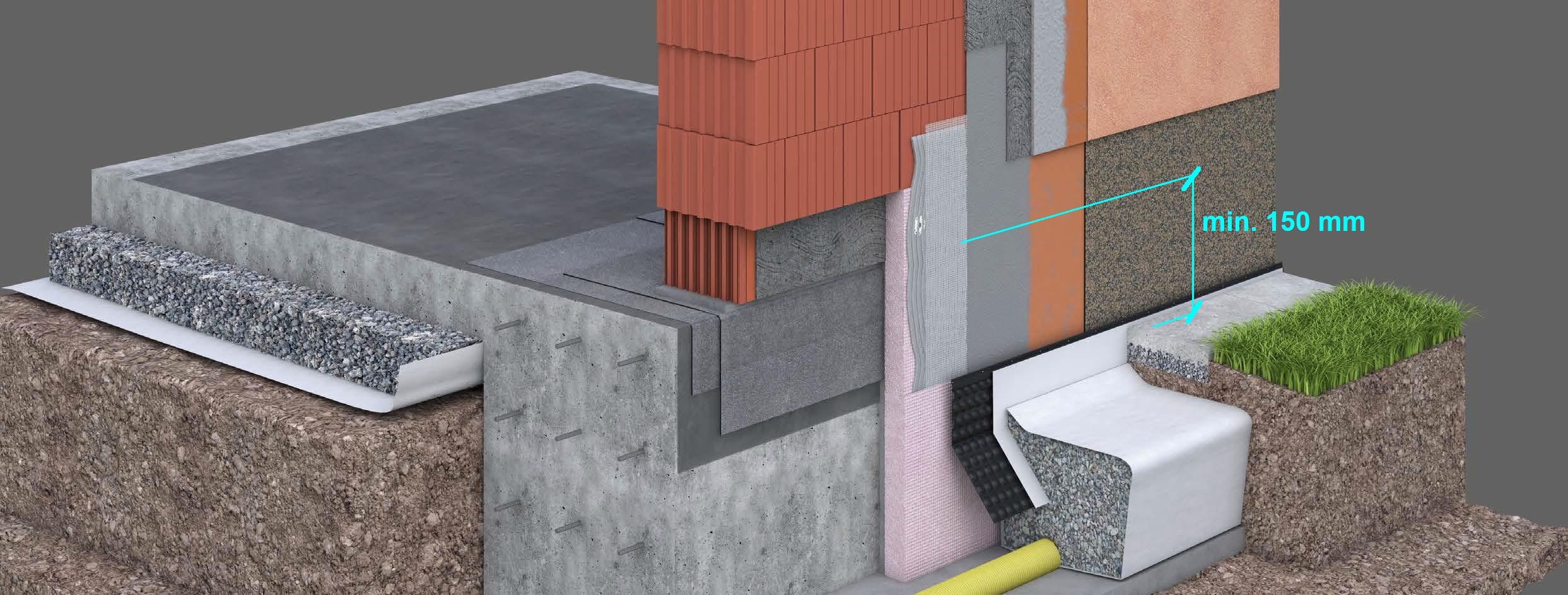 O6: V daném případě nevhodně osazeného objektu, kde již nebylo možné úroveň vodorovné hydroizolace vůči úrovni terénu změnit, bylo provedeno mechanické kotvení soklové tepelné izolace, kotva byla >150 mm nad úrovní terénu. V našich podkladech doporučujeme úroveň vodorovné hydroizolace nepodsklepeného domu min. 150 mm nad úrovní upraveného terénu, kotvy soklové tepelné izolace pak doporučujeme umisťovat nad touto úrovní.