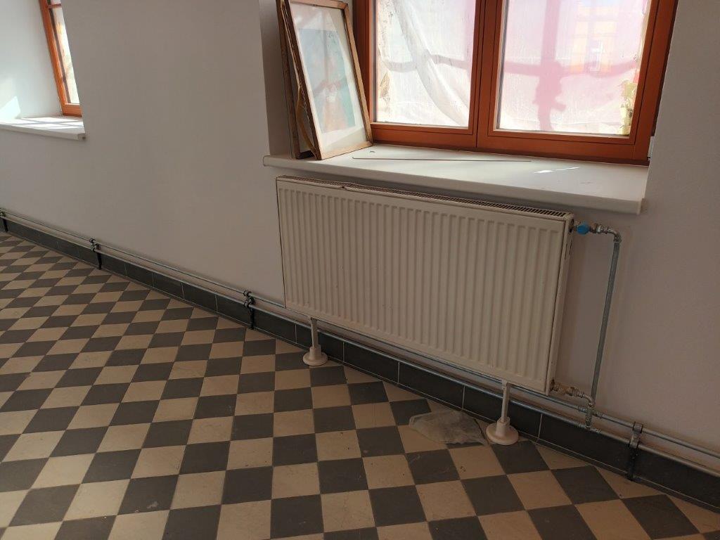 O10: Radiátory pouze stojí na nožičkách. Dle informací uživatele objektu dosud k žádné poruše při provozu školy nedošlo. Jejich stabilitě zřejmě přispívá přiznané kovové rozvodné potrubí topné vody. Případnou další stabilizaci by bylo možné řešit nerezovou kotvou, která by měla být v oblasti prostupu izolací z pěnového skla pečlivě zatmelena asfaltovou lepicí hmotou tepelné izolace.
