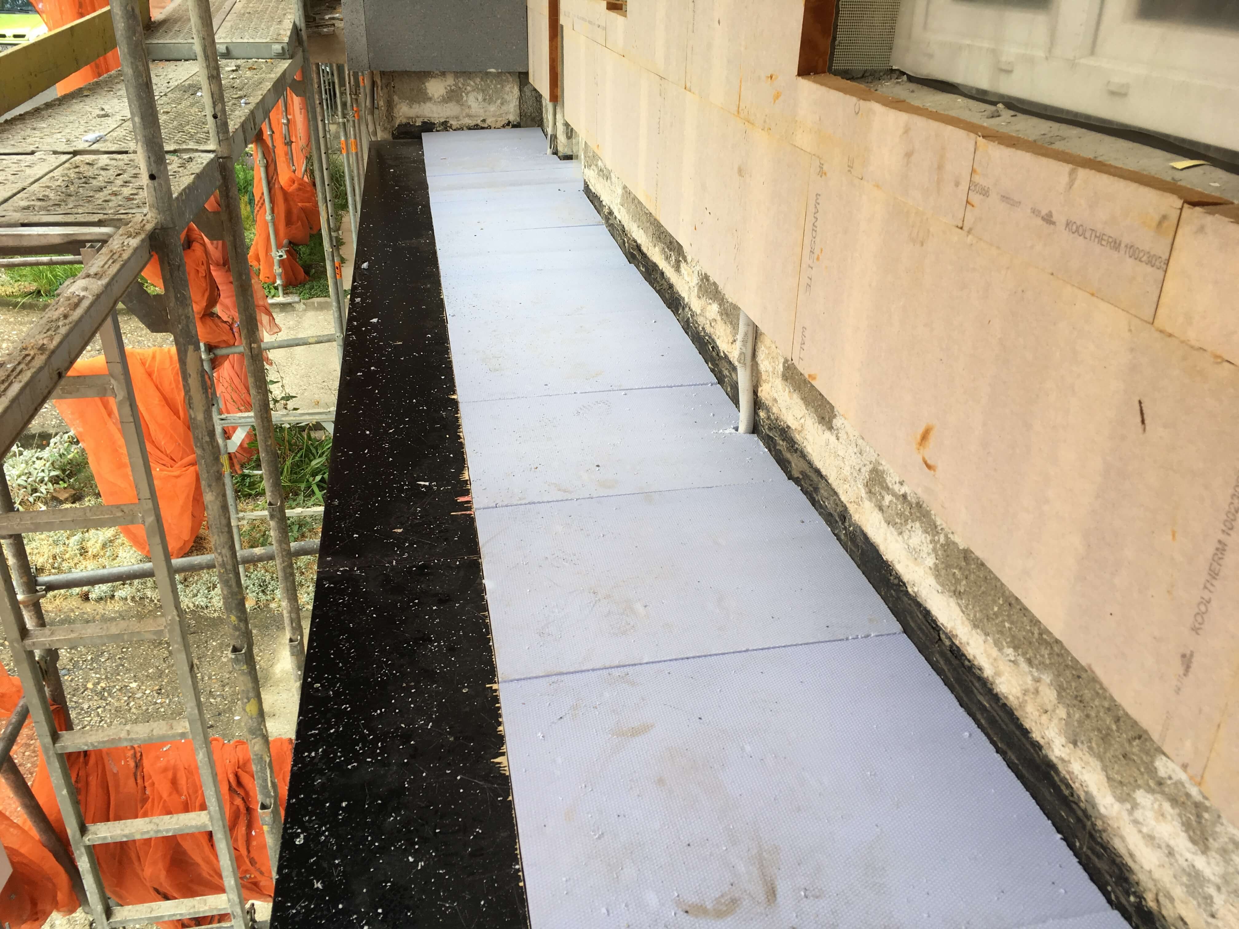 Nové řešení skladby spočívalo v provedení povlakové hydroizolace z PVC-P tl. 1,8 mm na dostatečně spádovaný podklad (2%) tvořený tepelnou izolací z XPS. Tuhá tepelněizolační vrstva byla zvolena z důvodu lokálně podepírané pochůzné vrstvy (dlažba na podložkách či dřevěný rošt, dle preference uživatele), kvůli stabilitě byla nalepena k podkladu. Pochůznou vrstvu se spárami propouštějícími vodu k hydroizolaci pak bylo možné klást vodorovně, což zpříjemnilo užívání balkónů. Konzoly balkónů byly pochopitelně zatepleny i ze strany podhledu, aby byl omezen tepelný most touto konstrukcí.