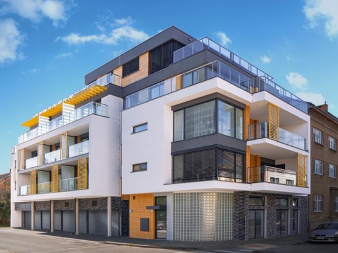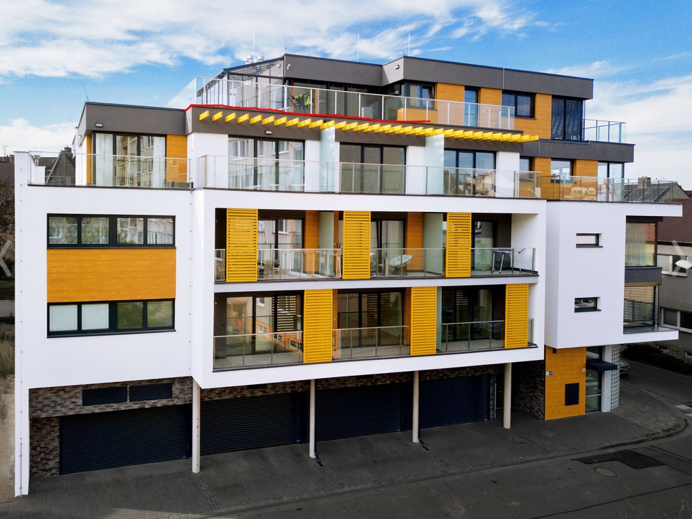 Jedná se o novostavbu bytového domu, která se stoupající výškou mění půdorysy podlaží a tím dává prostor venkovním terasám bytových jednotek. Skladba souvrství teras je běžnou plochou střechou s klasickým pořadím vrstev, na které je keramická dlažba světlé barvy na stavitelných terčích. Po obvodu je střecha ukončena atikou, která výškově navazuje na dlažbu terasy. Do konstrukce atiky jsou nakotveny sloupky zábradlí nesoucí skleněné výplně z bezpečnostního skla. Hydroizolační vrstva je tvořena z PVC-P fólie. Koruna atiky je viditelná, pro dosažení estetických záměrů architekta na ní byla použita fólie odstínu antracit.