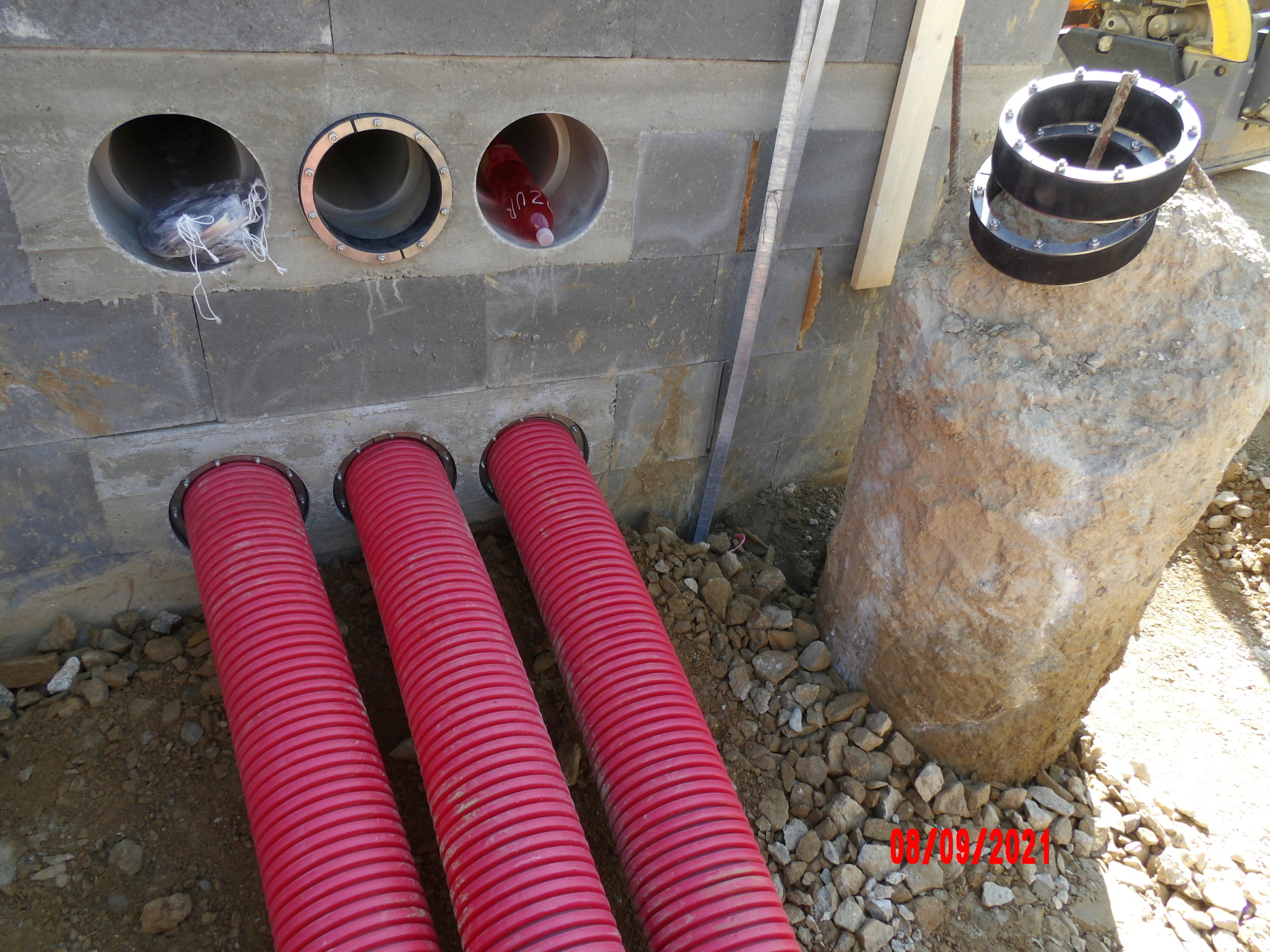 Následovaly práce na první vrstvě svislých izolací s poměrně složitějším vyměřením a opracováním vodorovných prostupů (obr.07). Prostupy byly připraveny osazením nerezových přírub při výstavbě ŽB stěny ze ztraceného bednění. Práce pokračovaly instalací injektážních trubic, druhé vrstvy PVC, svařením jednotlivých sektorů a přechodových trubic.