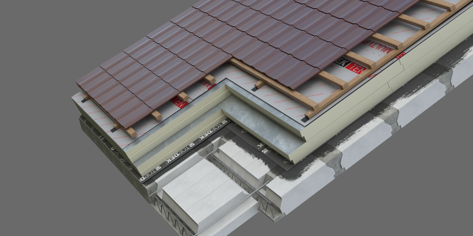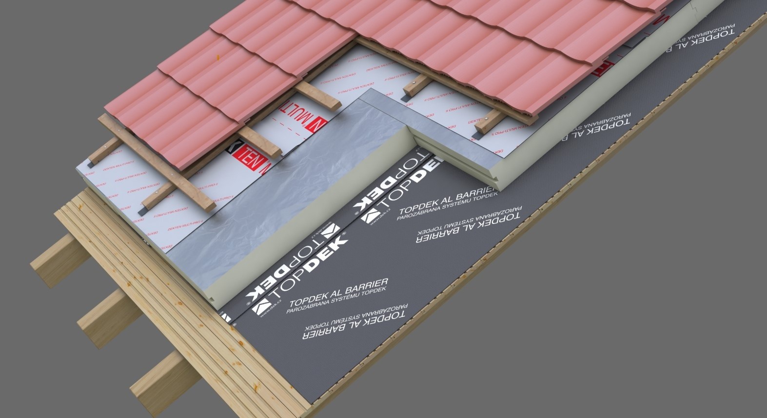 Tepelná izolace TOPDEK 022 vytváří na šikmině dostatečně tuhý podklad pro realizaci doplňkové hydroizolační vrstvy z difuzní folie DEKTEN PRO PLUS. Vznikne tak DHV konstrukčního typu 2.2, což odpovídá třídě těsnosti 4 dle publikace Pravidla pro navrhování a provádění střech, CKPT z roku 2014. Pokud by navíc kontralatě byly vůči DHV těsněné speciální páskou nebo tmelem, bylo by docíleno konstrukčního typu 2.1 a třídy těsnosti 3. Lze považovat za přijatelné, že nad střešní dutinou je DHV z fólie lehkého typu bez podkladu napnuta mezi krokvemi. Jedná se o malý rozsah ve vrcholové části střechy a případné drobné úkapy je povrch použitého materiálu tepelněizolační vrstvy schopen zadržet tak, aby se mohly odpařit do vnějšího prostředí, je-li správně zajištěno větrání střešní dutiny. Navíc při daném sklonu střechy bude plechová drážková krytina podložená asfaltovým pásem velmi těsná. Nutno ale dodat, že pás pod krytinou nelze dle Pravidel považovat za doplňkovou hydroizolační vrstvu. Není totiž umožněn hladký odtok vody po jeho povrchu ani odvod vlhkosti mezi ním a krytinou větráním.