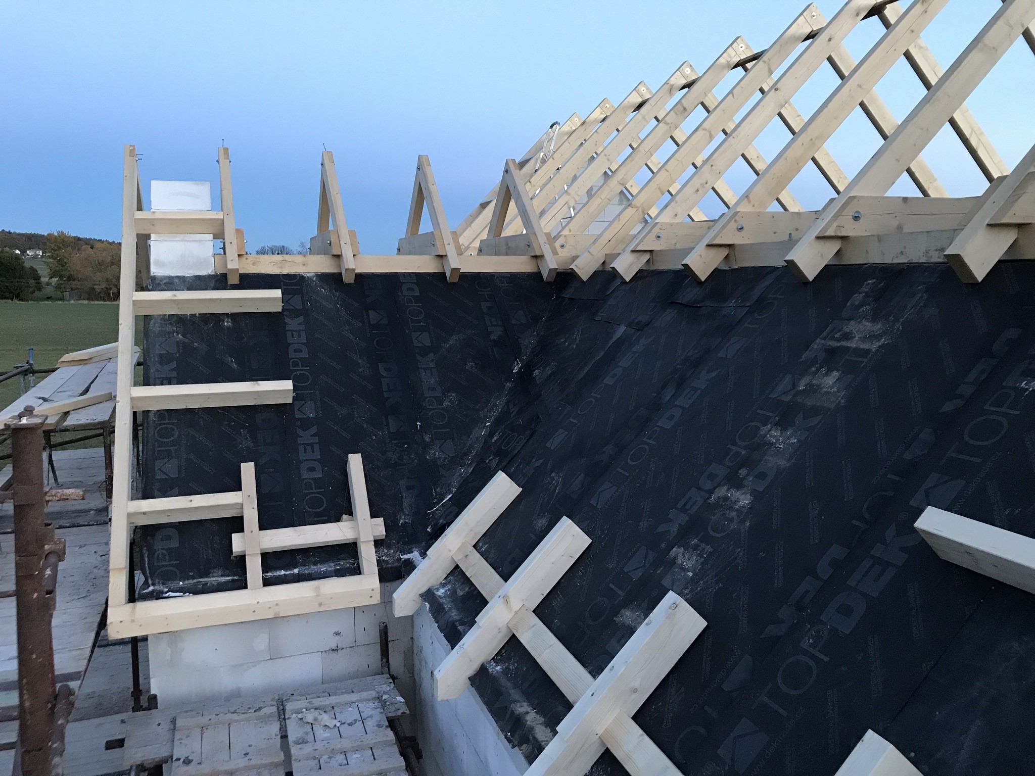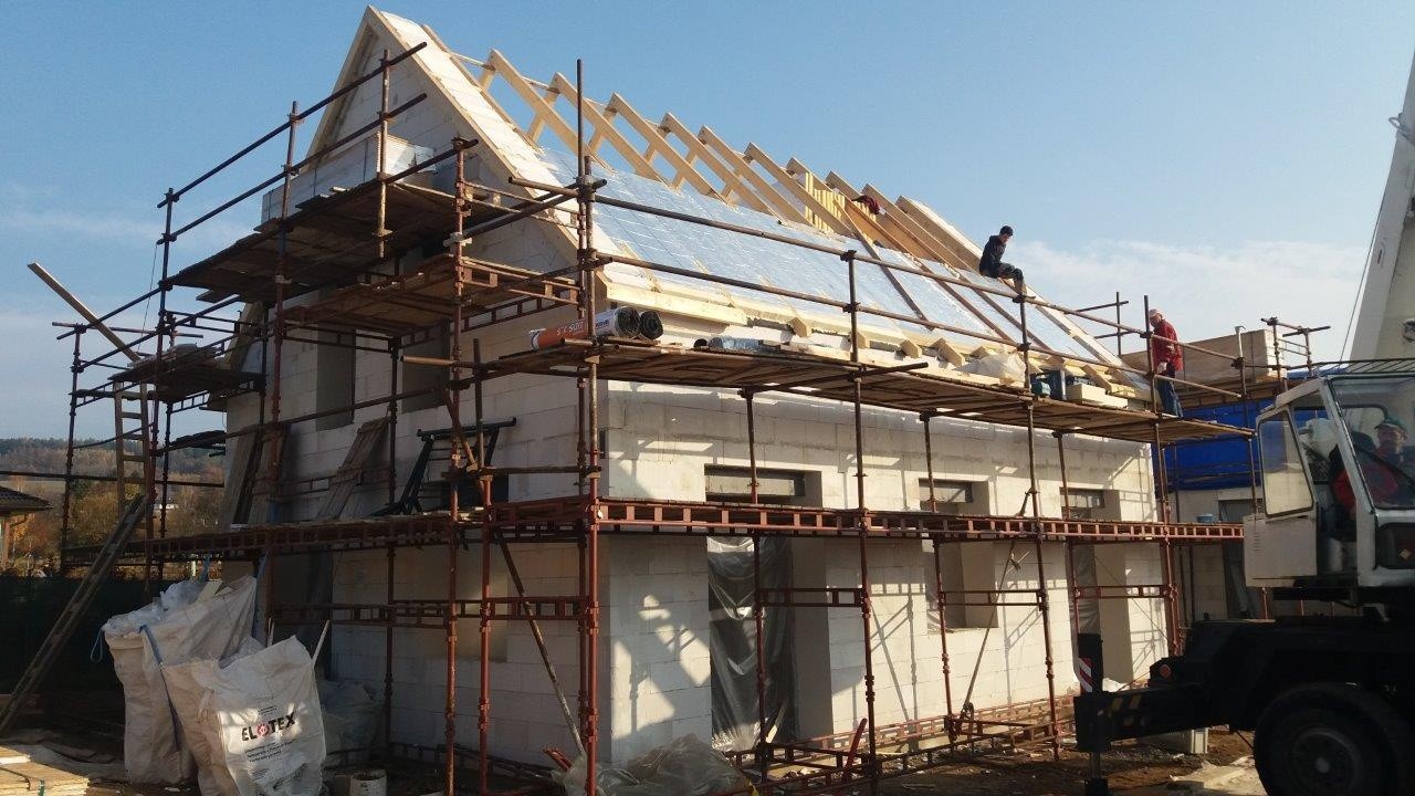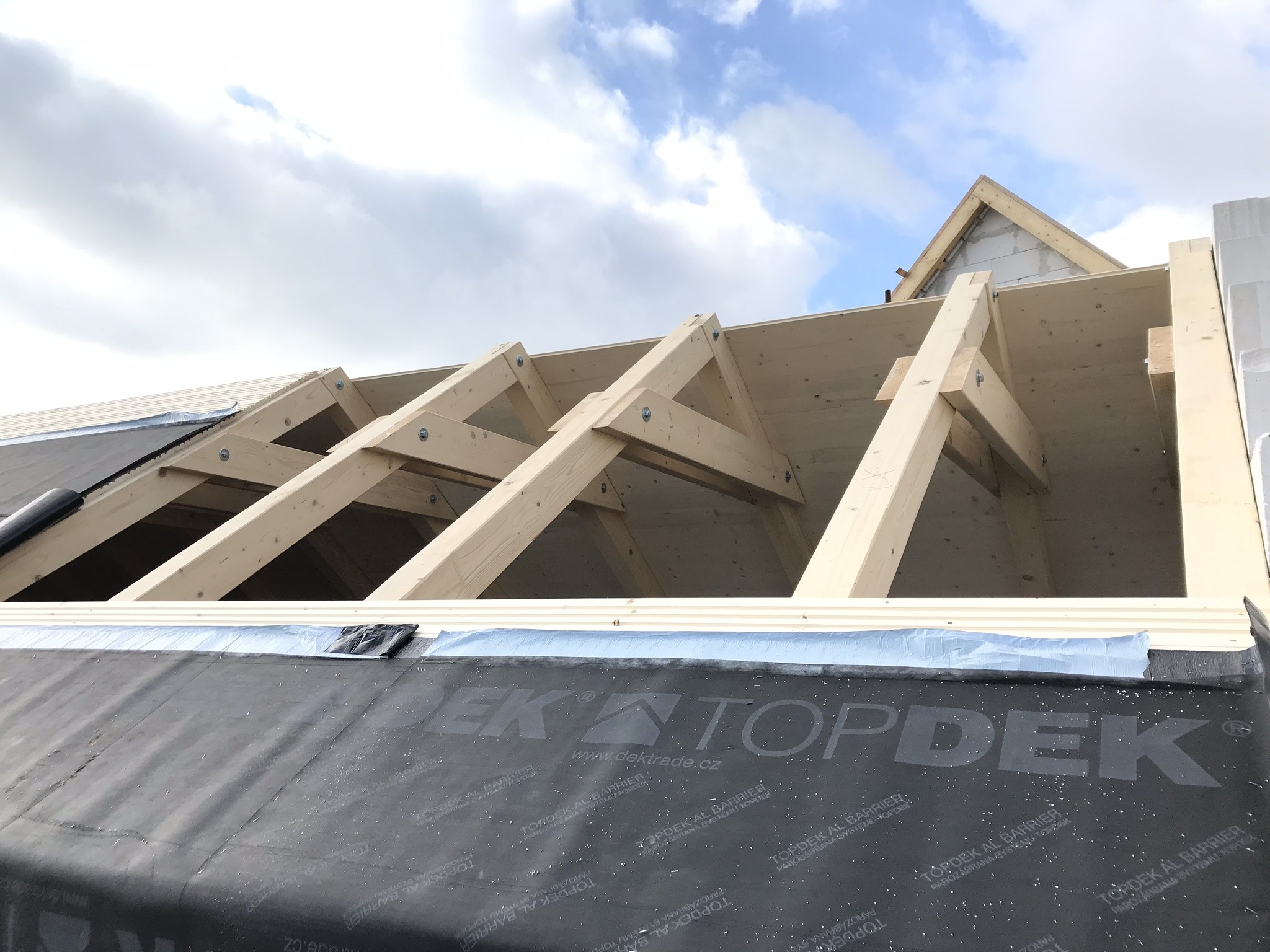 Tepelná izolace TOPDEK 022 PIR je kladena na masivní nosnou konstrukci s dokončenou parozábranou. Krov nad střešní dutinou ponese již jen DHV a krytinu. Ve střešní dutině pod vrcholovým krovem vznikl prostor pro skladování. Vstup do něj musí být zateplený a vzduchotěsný.