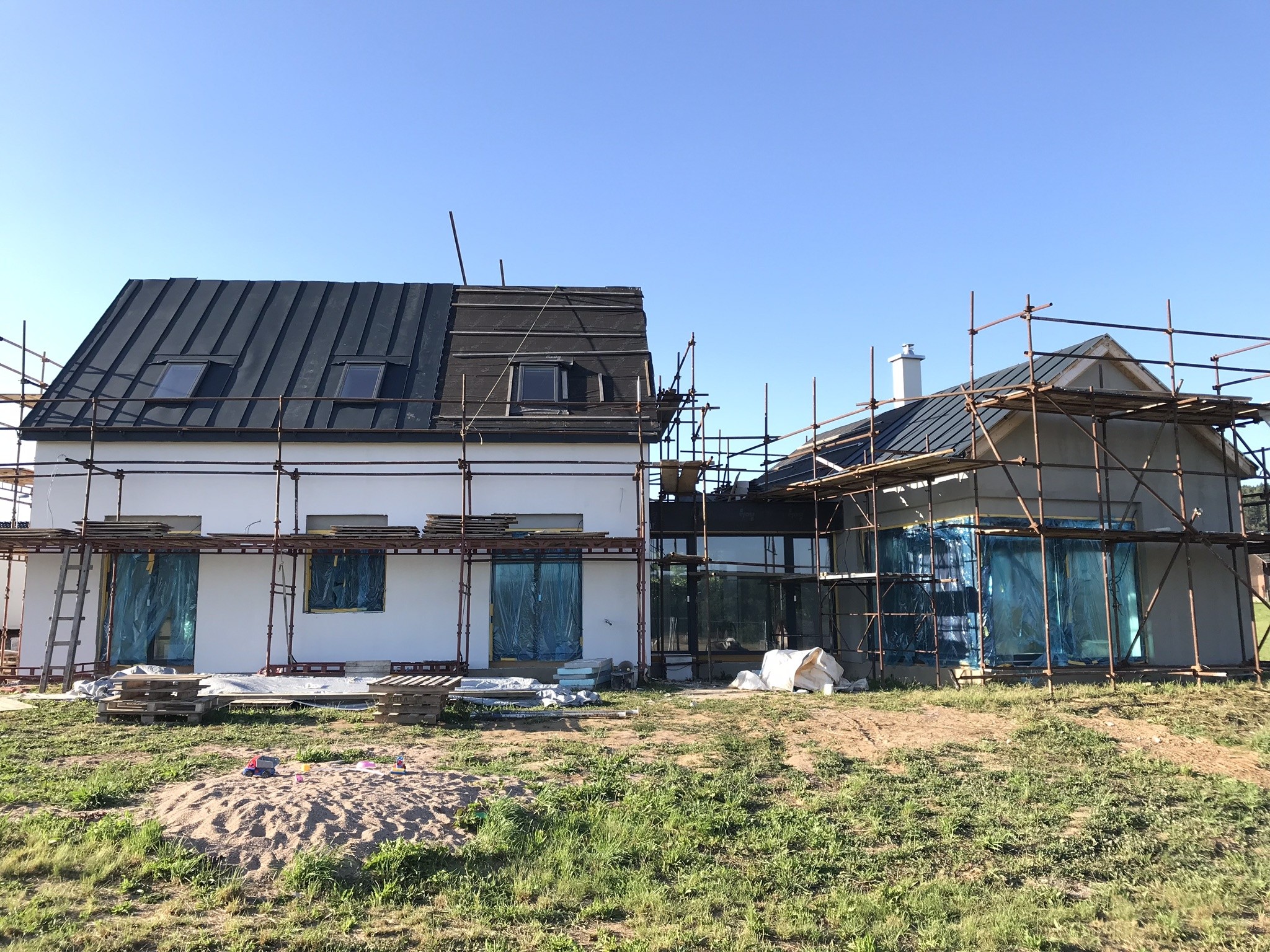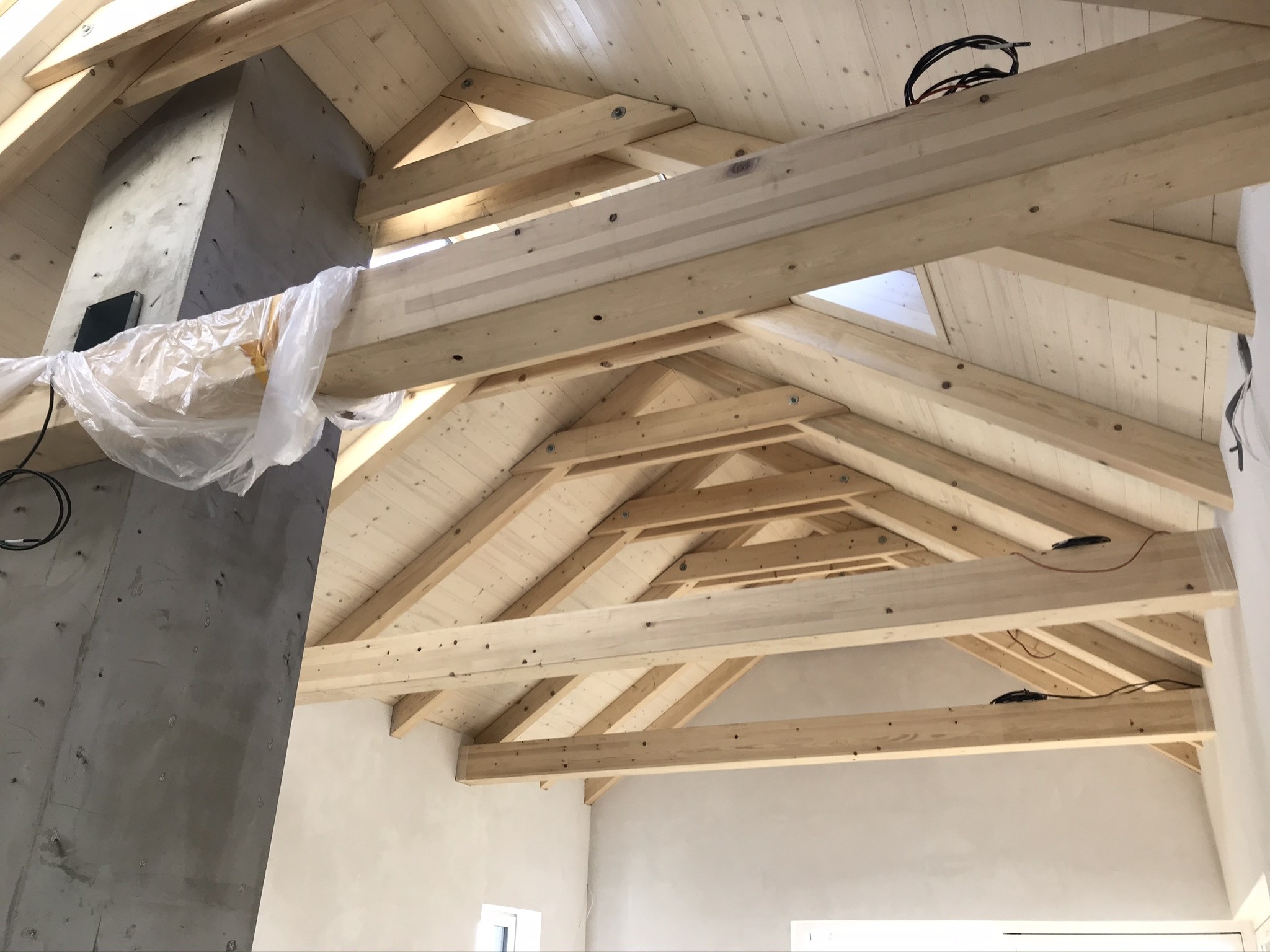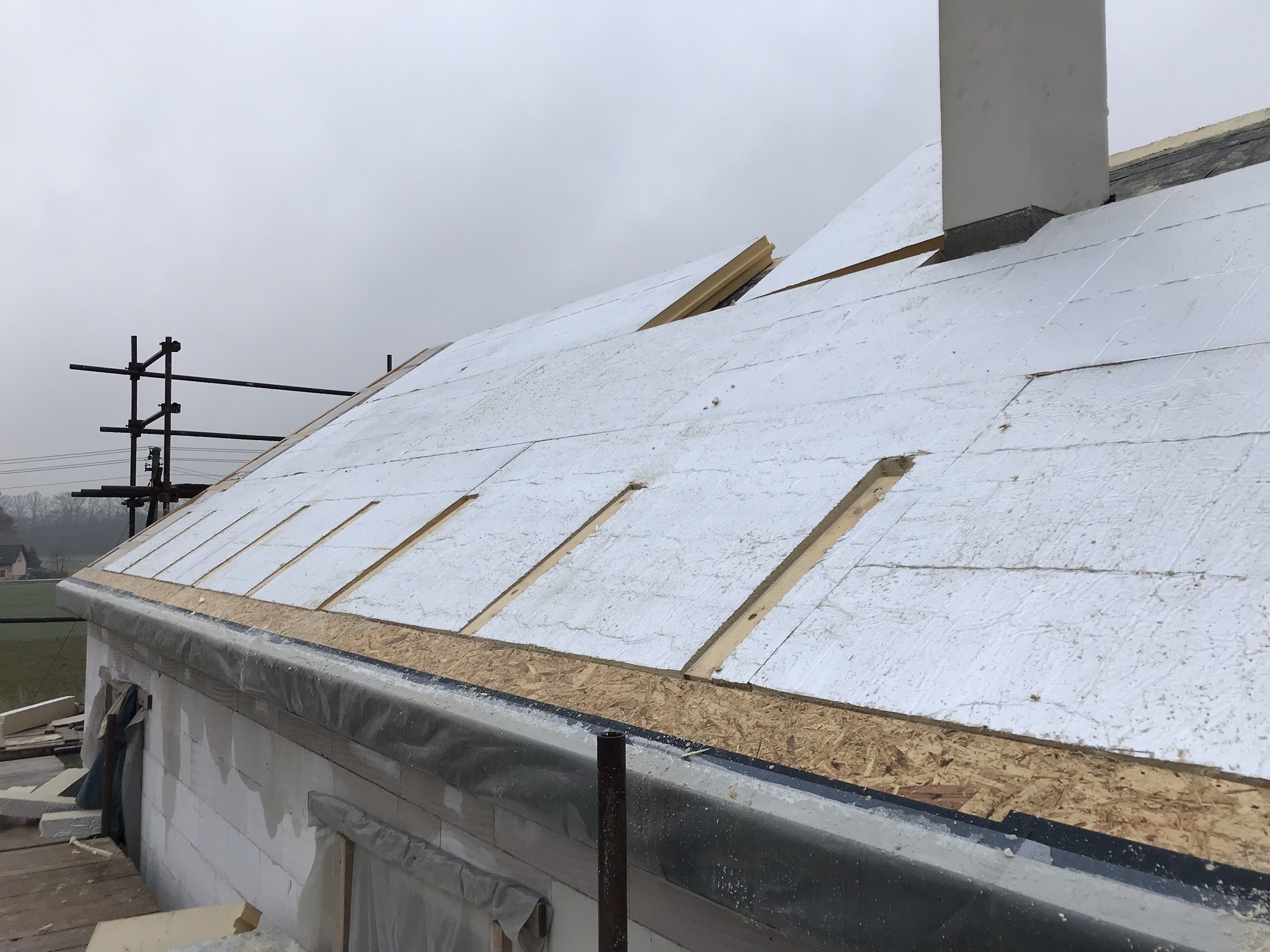 Tepelná izolace TOPDEK 022 PIR je kladena na masivní nosnou konstrukci s dokončenou parozábranou. Krov nad střešní dutinou ponese již jen DHV a krytinu. Ve střešní dutině pod vrcholovým krovem vznikl prostor pro skladování. Vstup do něj musí být zateplený a vzduchotěsný.