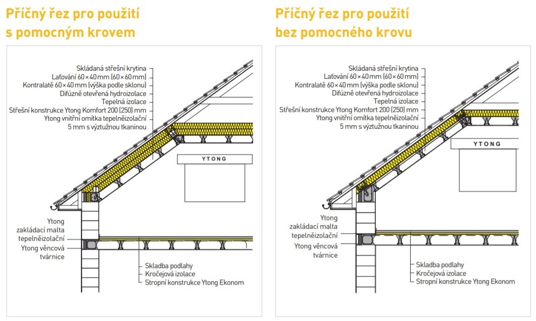 Vzhledem k tomu, že v podkroví dvoupodlažní části jsou umístěny ložnice a dětské pokoje, byl projektant rozhodnutý nejít v řešení nosné konstrukce střechy cestou tradičního dřevěného krovu a využil v našich končinách zatím méně obvyklou masivní nosnou konstrukci. Když to hodně zjednodušíme, jedná se o nakloněnou stropní konstrukci z železobetonových nosníků s vloženými pórobetonovými tvarovkami. Hlavním argumentem pro tento systém byla tepelná pohoda v podkroví během horkých letních měsíců. Byla realizována systémová skladba DEKROOF 20-A (ve Stavební knihovně DEK označena ST.8004E).